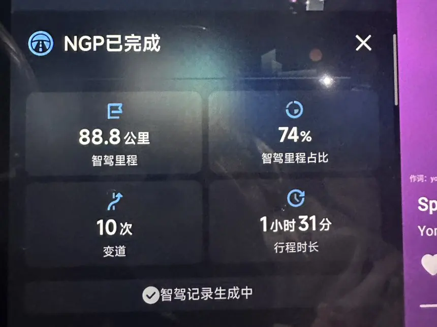 这一路大部分时间都交给了NGP,系统变道、跟车都很丝滑,几乎不用我操心,大大缓解了长途驾驶的疲劳。最惊喜的是电耗表现,14.4kWh/100km的成绩,在高速工况下相当给力,续航扎实不焦虑。