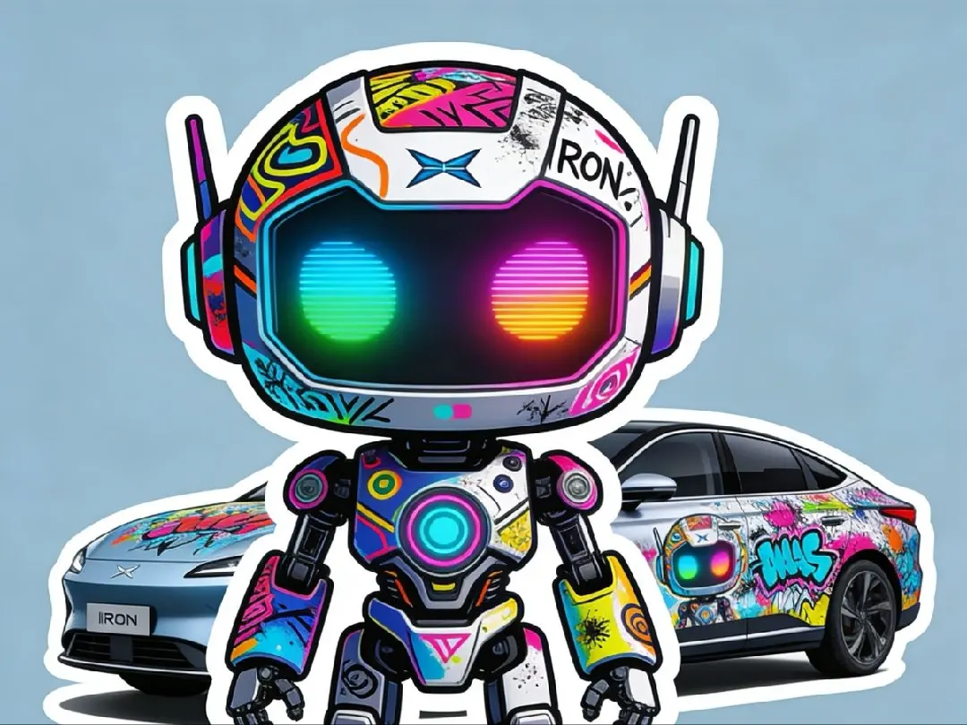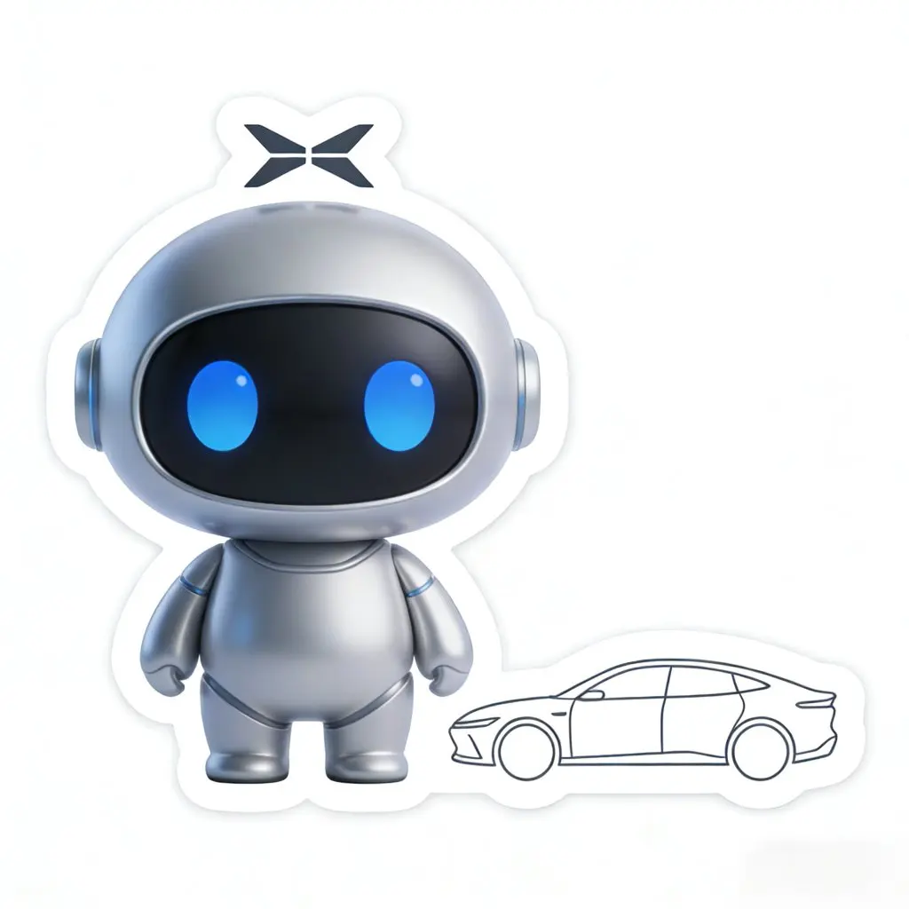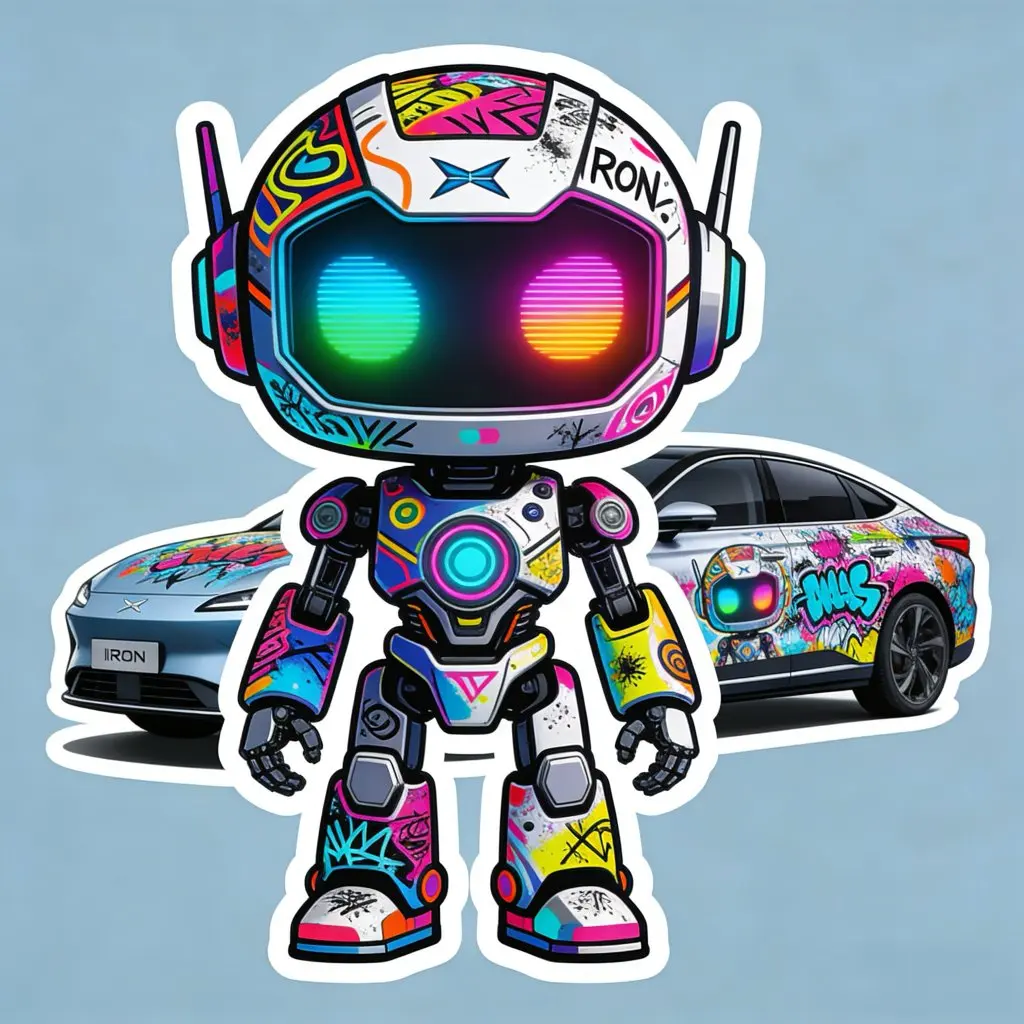 车贴以极简科技风呈现小p倚靠小鹏汽车,炫彩配色和银色配色呼应品牌调性,科技感与可玩性诠释人车AI一体的未来出行图景。