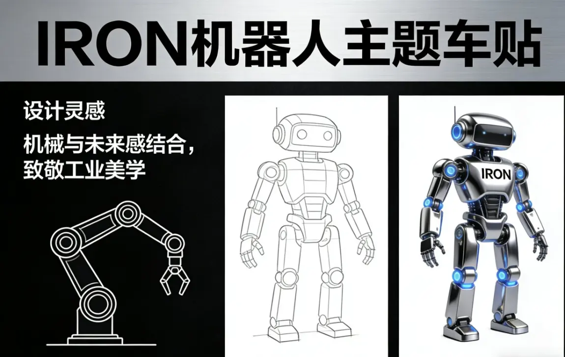 以IRON机器人为硬核主角,走机甲科技风。强化机械结构、棱角线条与力量感,搭配金属质感与光影效果,融合小鹏X元素,打造“智能机甲座驾”风格。整体酷飒硬朗,充满未来战斗感,适合追求个性、热爱机甲与硬核科技的车主,视觉冲击力强,彰显力量与科技并存的驾驶态度。