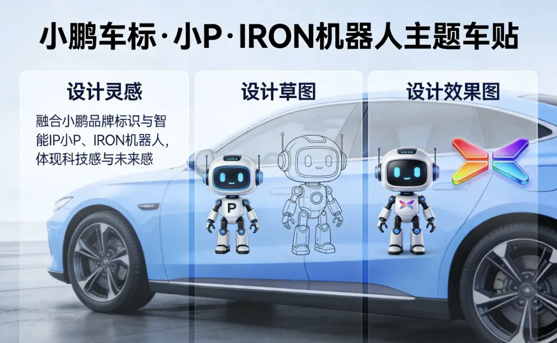 题记:本次车贴设计融合小鹏车标、小P与IRON机器人三大元素,以科技机甲风为主调,智能与力量结合,简约潮酷,彰显小鹏未来感与个性态度,视觉醒目统一。@鹏友大管家 @社区活动小姐姐