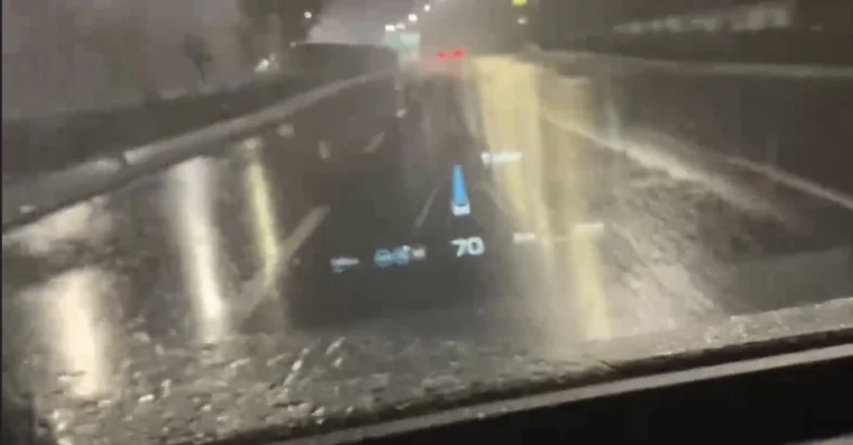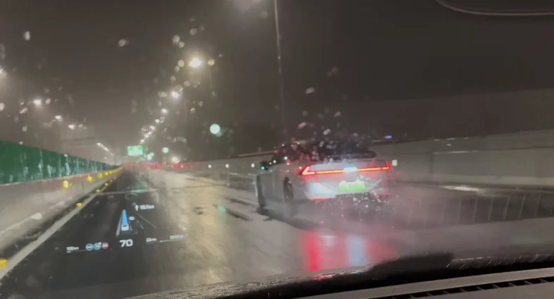 夜晚雨天的高架,暴雨天的NGP才是真高光!视线模糊也不慌,NGP稳稳居中、提前减速过弯。
