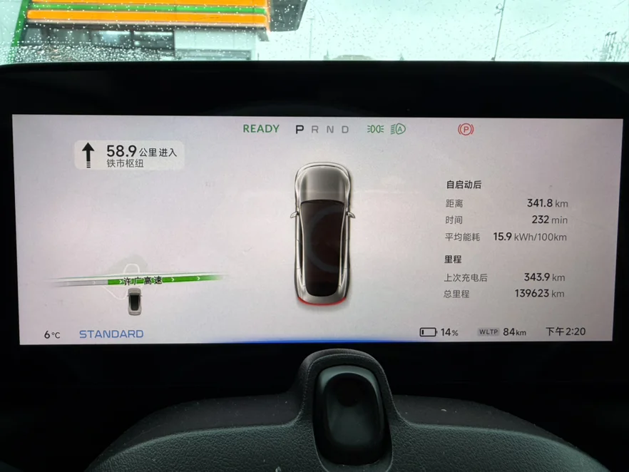 此时,P7仪表盘显示行驶了232分钟,跑了341.8公里,出发前WLTP是542公里,目前剩下WLTP的84公里,消耗WLTP的458公里,续航达成率七五折。
