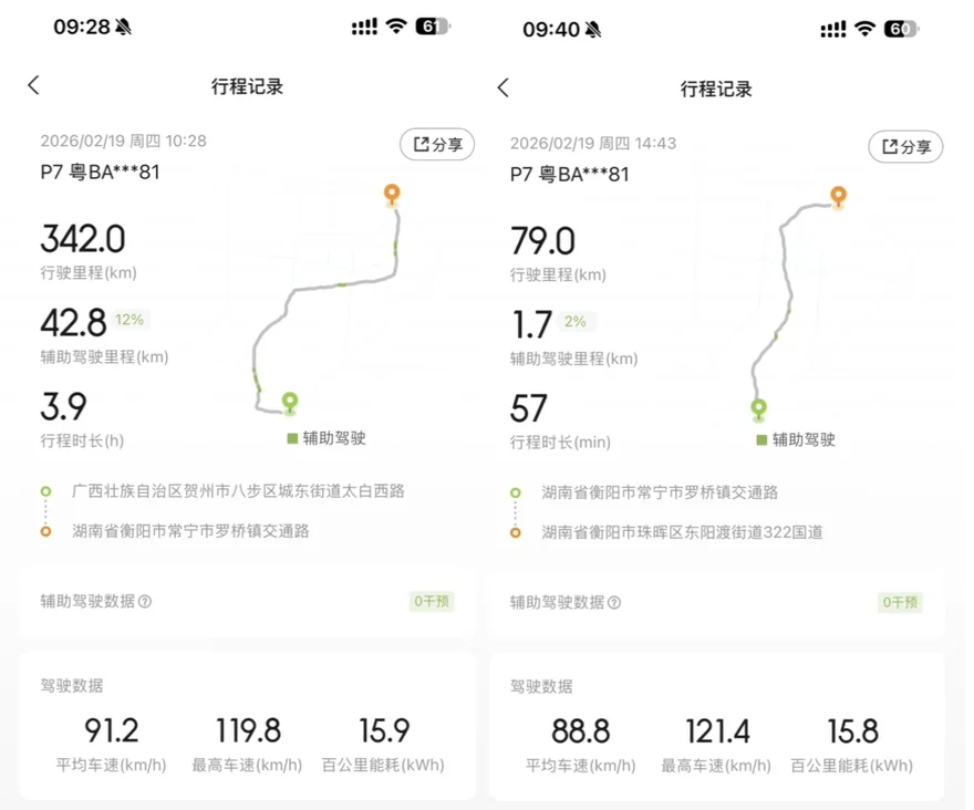 在app的行程记录来看,贺州到衡阳这段路,一共421公里,能耗在15.9Kwh和15.8kWh。