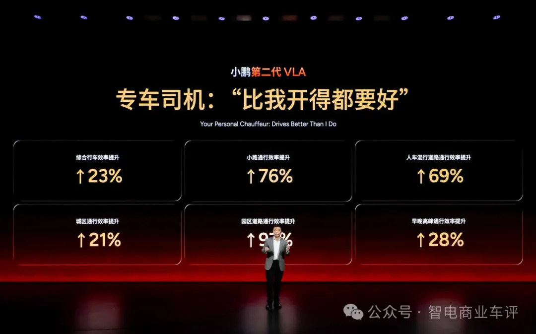 但小鹏第二代VLA的确有备而来,从数据效率来看,在保障安全与稳定性的基础上,其综合通行效率提升23%。细分场景下,小路通行效率提升76%,人车混行道路通行效率提升69%,城区通行效率提升21%,园区道路通行效率提升97%,早晚高峰通行效率提升28%。