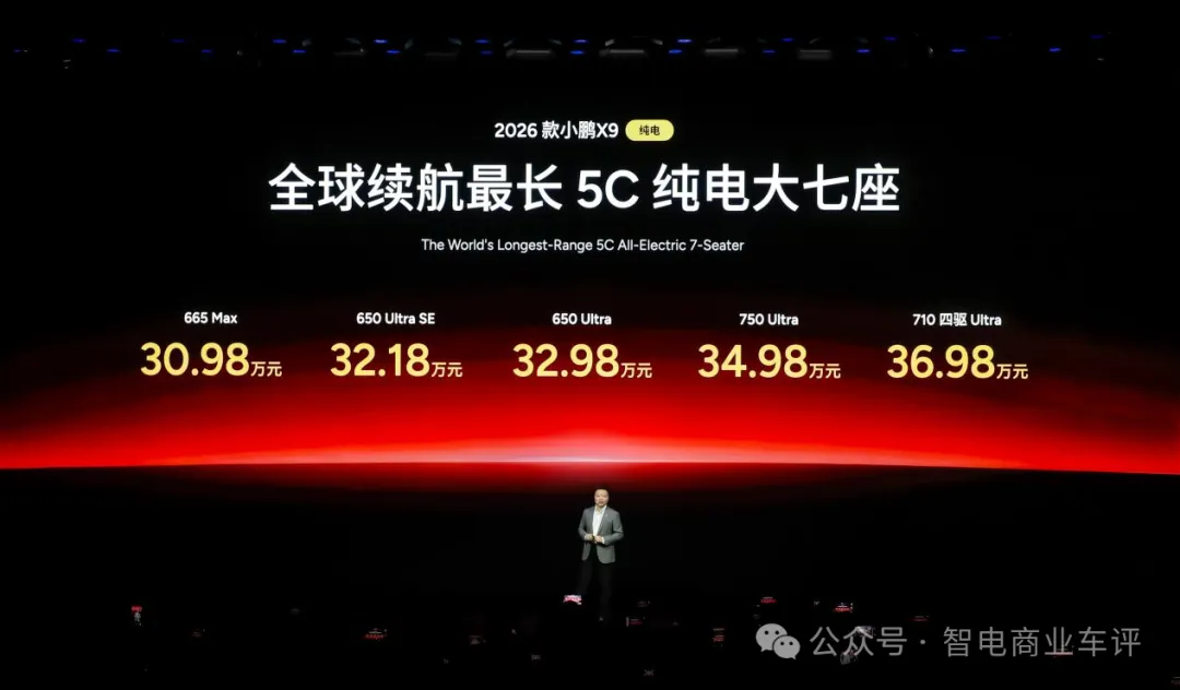 新车共推出5款版型,售价区间为30.98万元至36.98万元,产品力全面对齐此前上市的X9超级增程版。2026款小鹏X9纯电版超长续航两驱版续航里程高达750km,全系标配800V+5C超充AI电池,充电8分钟可补能400公里,CLTC综合电耗低至15.9kWh/100km。