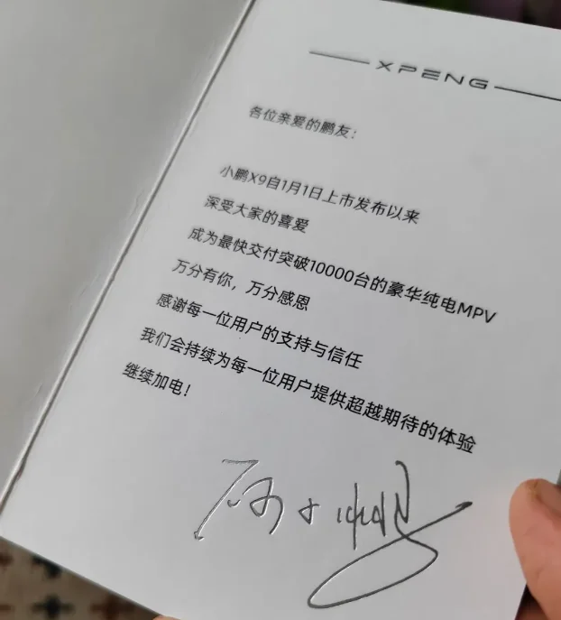 有一天在小鹏社区里面看到x9车主收到的一份礼物里面有大师兄的签名卡片