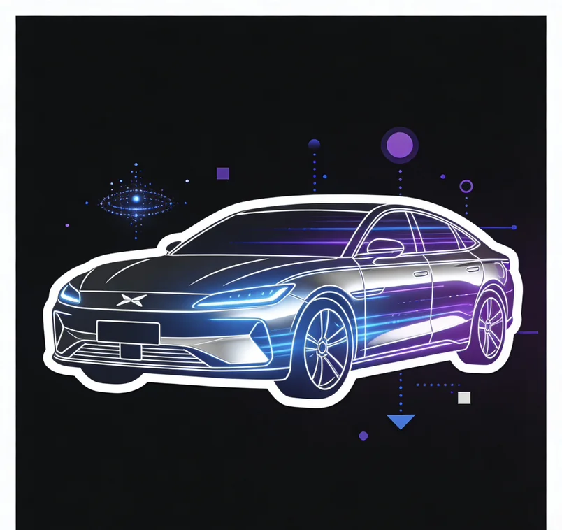 • 下方的小鹏轿跑车型采用纯白霓虹线稿勾勒,去除冗余细节,只保留流畅的车身线条与标志性灯组轮廓,突出智能电动车的极简科技美学。