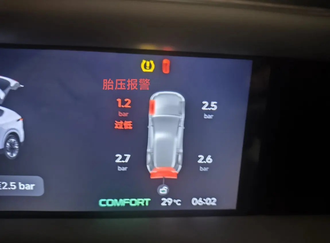 电梯门打开径直走到我G6车旁边,我拉下车把手自动解锁,主驾车门“咔嗒”一声解锁,坐进驾驶位习惯性地系上安全带,车机自检后主驾屏幕突然弹出醒目的黄色警报——胎压异常,主驾左前轮胎仅1.2bar。