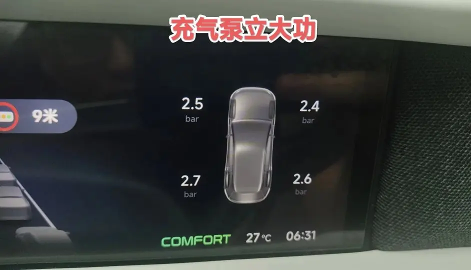 于是我打开后背箱找到了充气泵,中控屏下点烟器插上电源线,拔掉左侧轮胎气嘴螺帽,插上充气泵准备开始充气,设置胎压2.5bar开始充气,从1.2Bar到2.5bar大约充了五分钟。