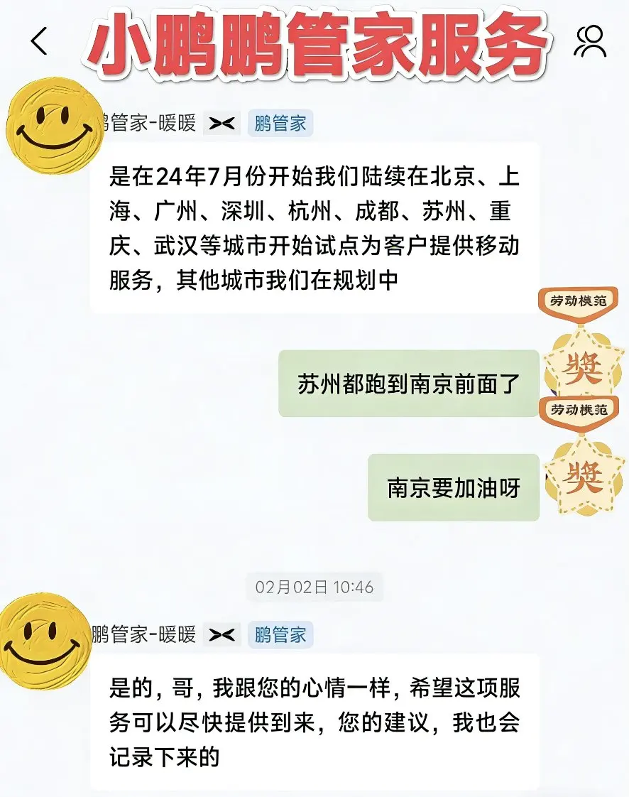 我也咨询了鹏管家南京没有上门补胎服务,4s店也没有补胎服务,只能直接找修理厂补胎。目前全国上门补胎服务是在24年7月份开始我们陆续在北京、上海、广州、深圳、杭州、成都、苏州、重庆、武汉等城市开始试点为客户提供移动服务,其他城市我们在规划中。同时我也问了鹏友群关于小鹏道路救援补胎服务,有鹏友给我晒出了广州道路救援补胎服务照片,真羡慕希望南京早点开通。