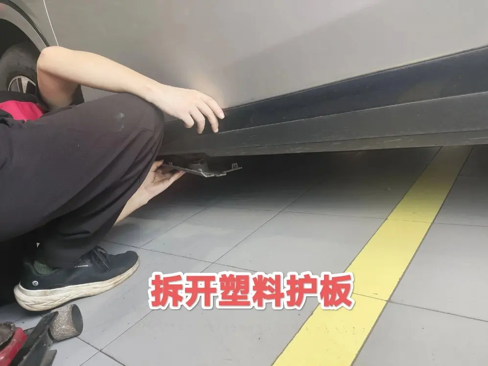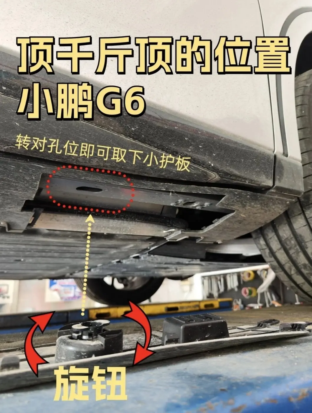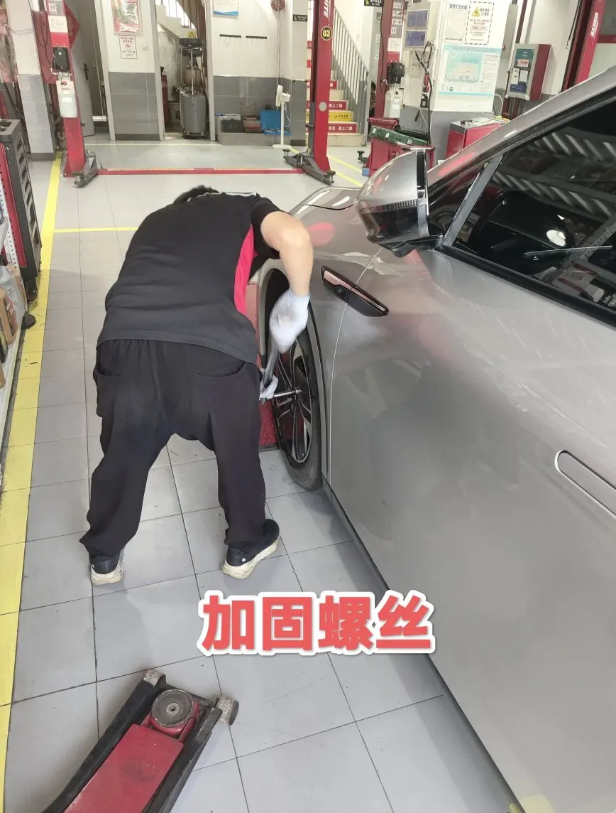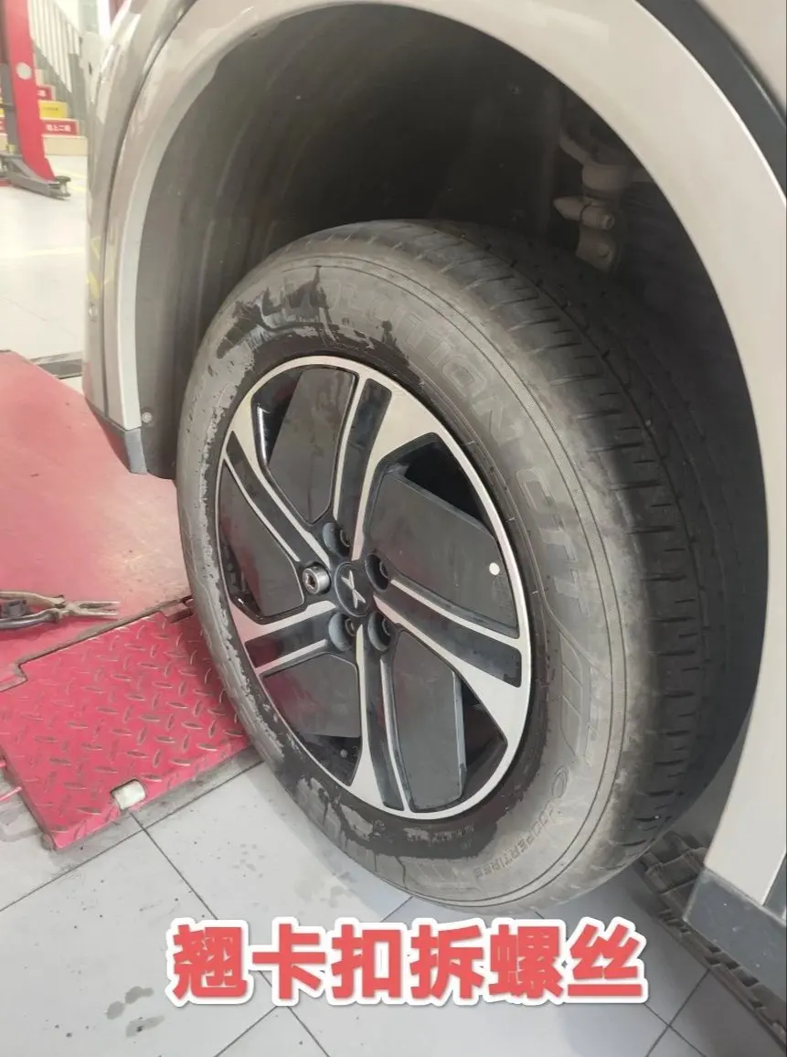 到维修店后和师傅说明情况,提醒师傅小鹏G6的一些特殊之处。比如G6底盘有塑料防护,轮胎边上有塑料卡扣,需旋转拿掉后才能顶起车辆;轮胎螺栓外面有保护套,要用一字螺丝刀小心撬开,不然容易撬花。