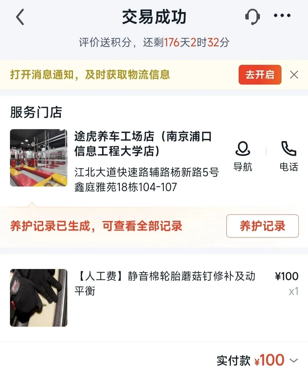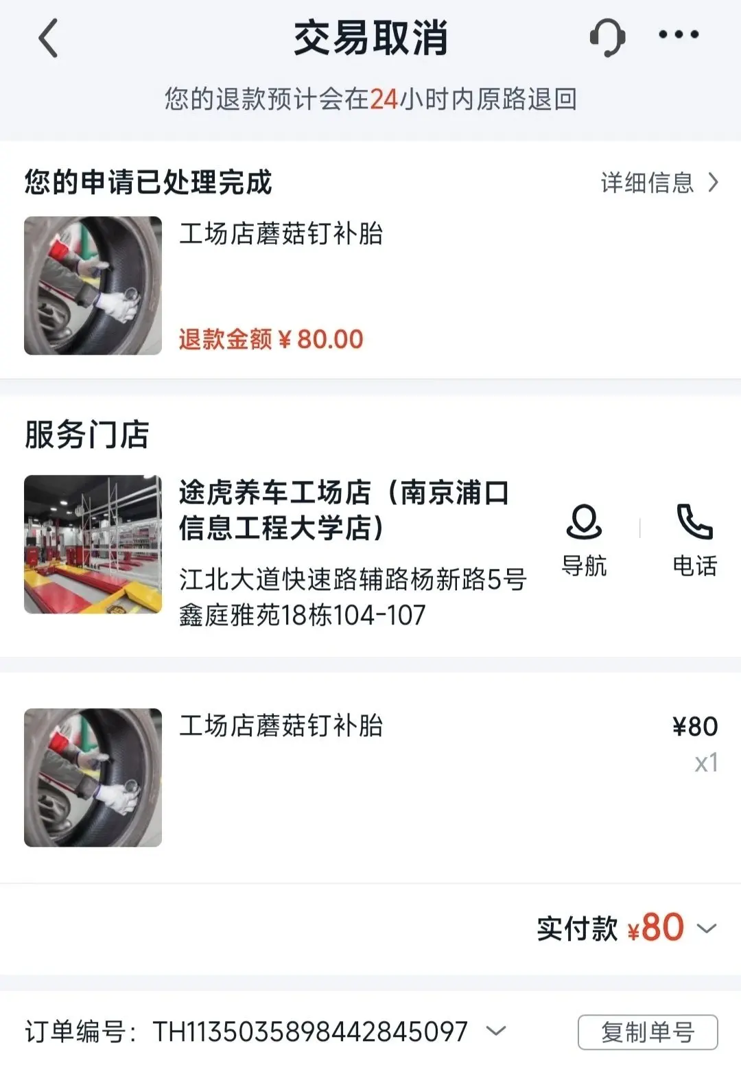 因为我在途虎上下定是80元蘑菇钉补胎服务不含静音棉,所以在平台上进行退款后重新线上付款100元: