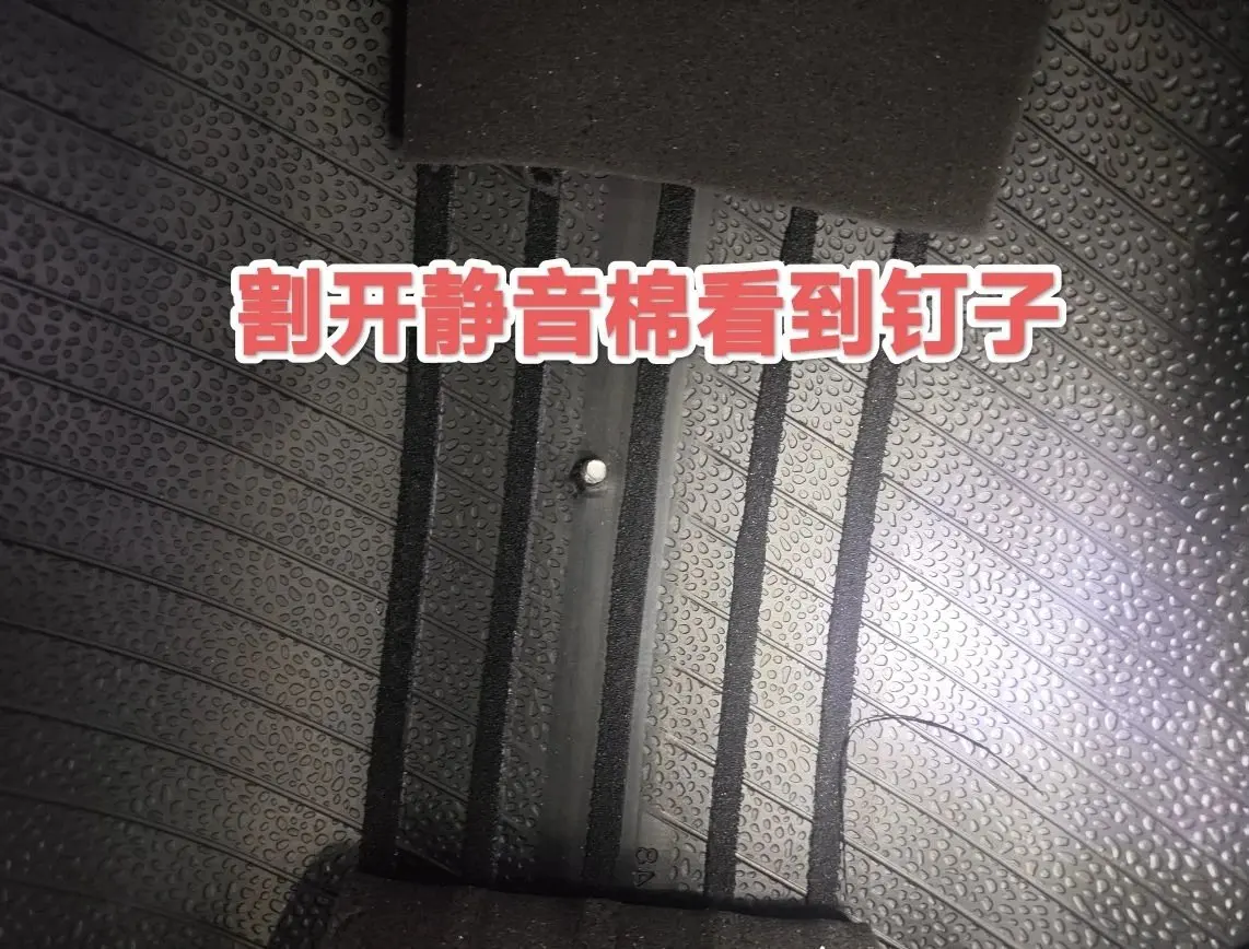 我表示同意后小哥哥继续操作割开隔音棉露出来扎胎的螺丝钉,小哥哥也叫我过来看下,目测至少3mm粗的钉子,告知用蘑菇钉进行补胎价格80元,加上是静音棉20元总费用100元。