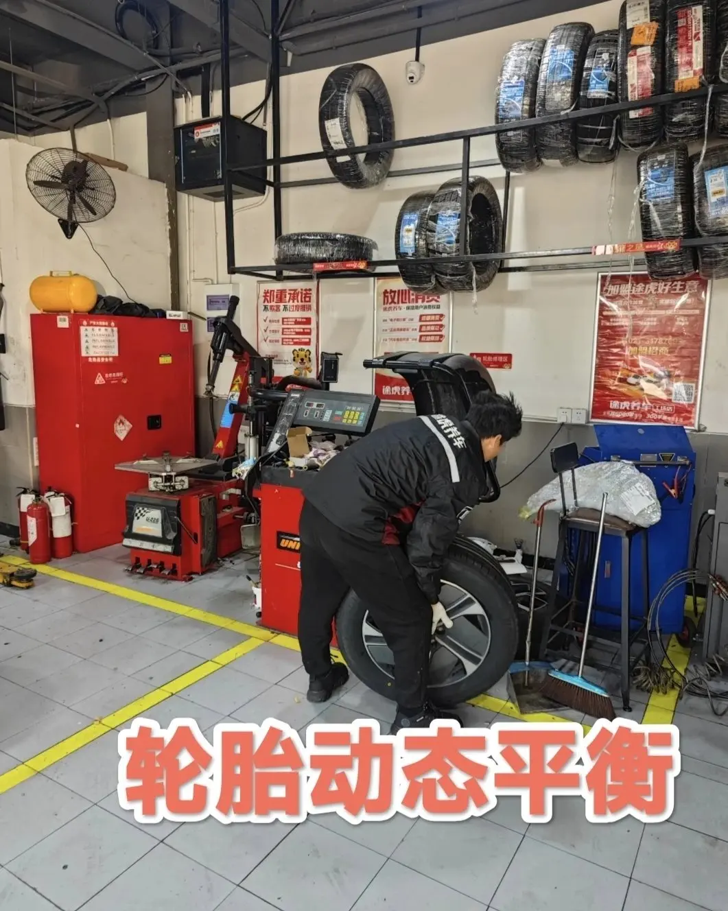 轮胎动态平衡后小哥哥开始安装轮胎,安装轮胎也是比较快的,螺丝拧紧后开把千斤顶放下车身,然后再加螺丝重新再加固下拧紧,整个补胎流程就此结束。