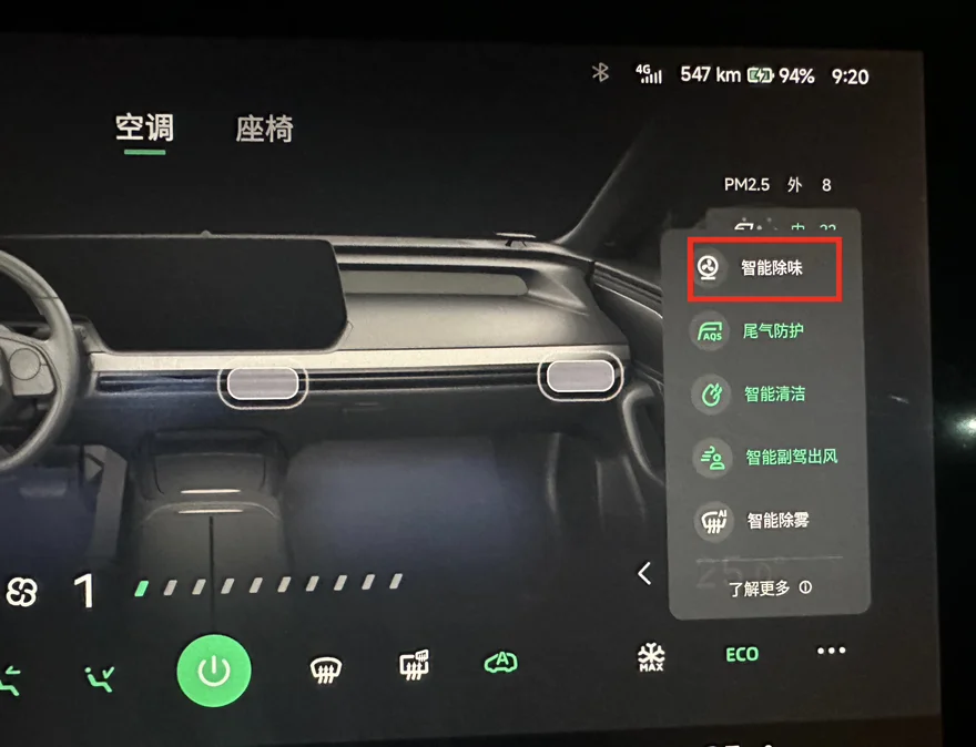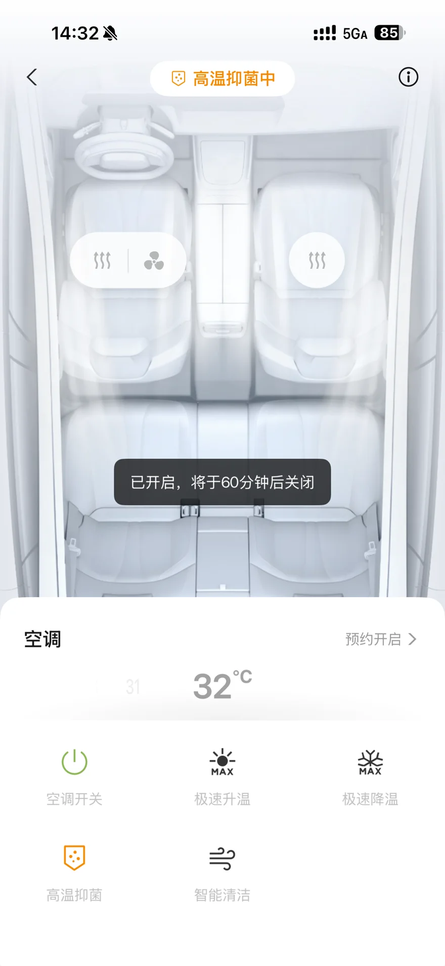 这里要注意,使用此功很会消耗一些电。所以建议电量有一半以上再用,另外高温抑菌功能工作时间是1小时,车内也要保证无人无易燃易爆的物品。
