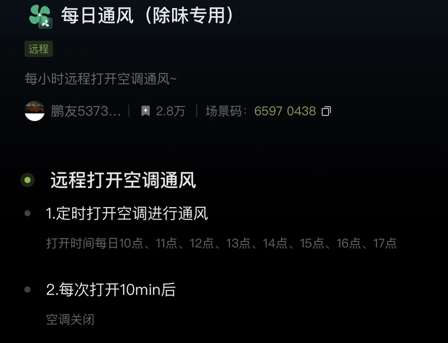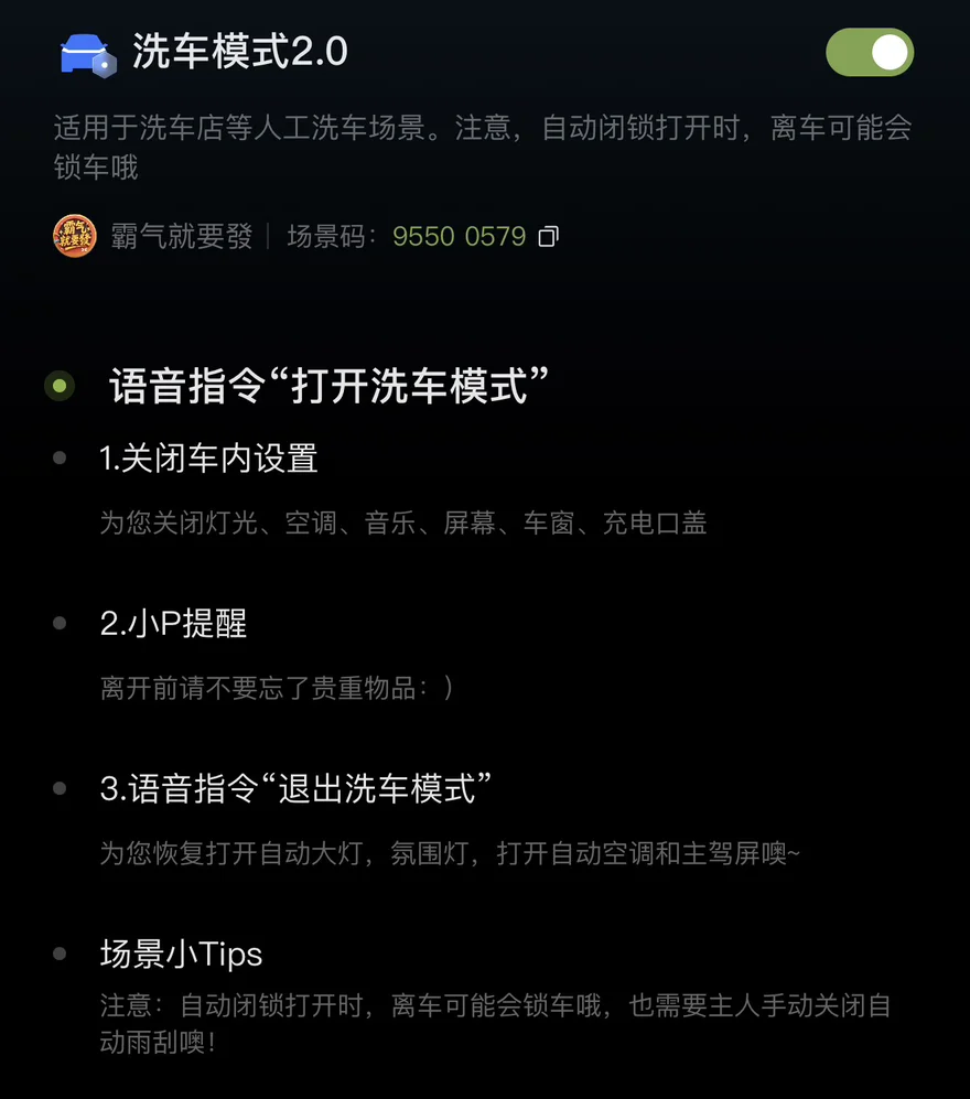 洗车模式同样好用,智慧场景里提供了很多好用场景码,也可以自己发挥想象力进行自创!