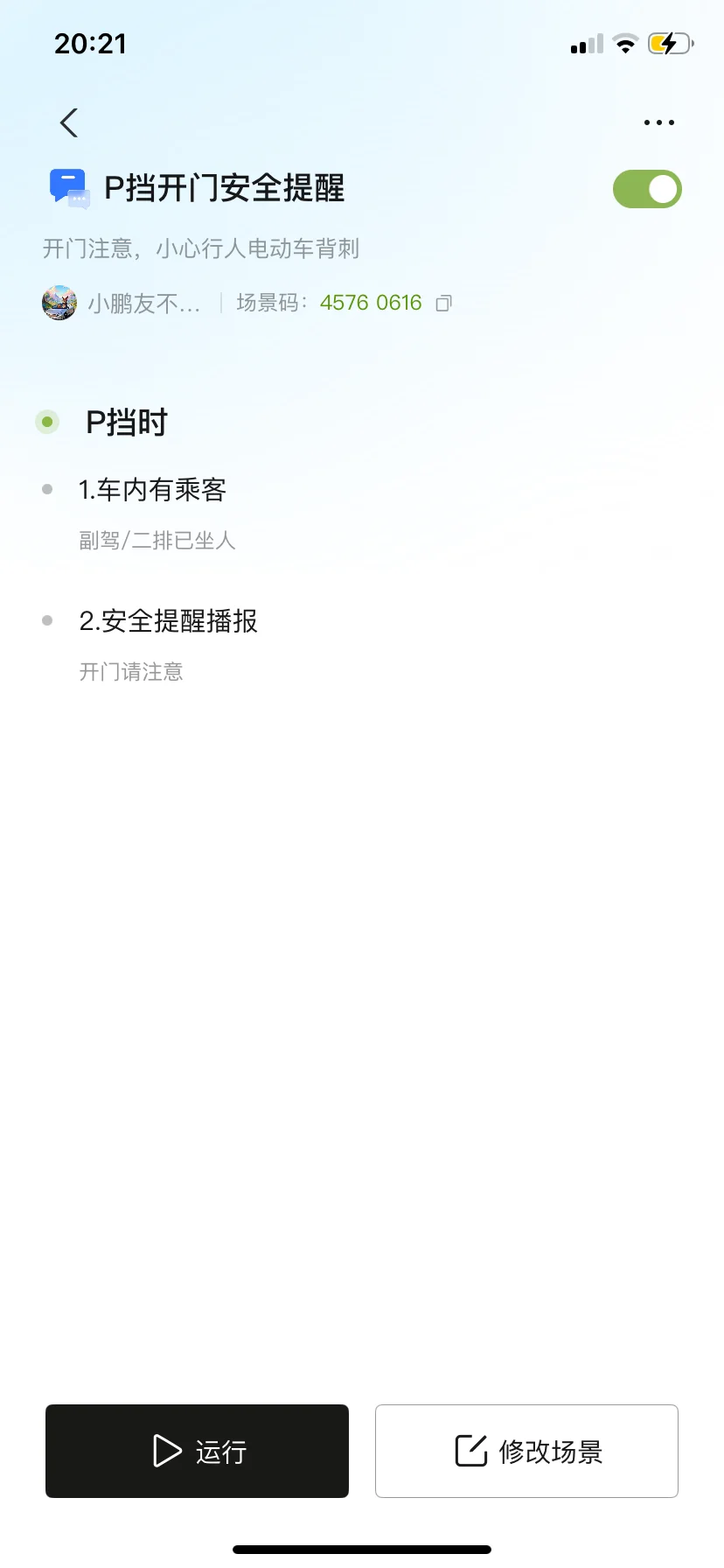 第五👉和大家分享下我的用车小技巧,开车最怕就是后方来车,副驾和后排下车被撞,小鹏智慧场景可以输入场景码:45760616 ;进入小鹏App,智慧场景搜索即可查看,防止后方行人机动车被刺,超级高级好用
