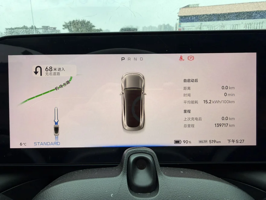 下午5点27分从衡阳出发,P7的仪表盘显示,WLTP电量是519公里,室外温度仅6度,对于我这个广西玉林人来说,6度算是差不多遇过最低的温度了,所以,车内需要开暖气。另外驾驶模式设置成标准模式,能量回收设置成低。