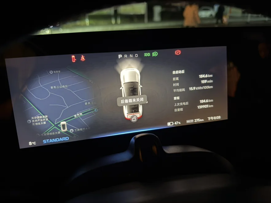 此时,P7仪表盘显示行驶了159分钟,跑了184.6公里。WLTP续航剩余275公里,出发前是519公里。所以消耗了244公里,续航达成率在七六折。