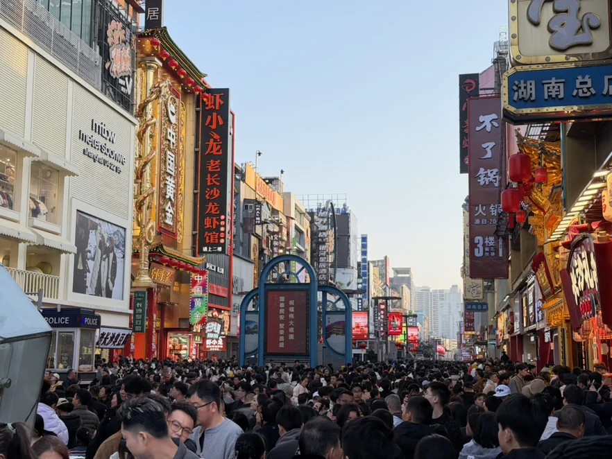 走到了步行街人山人海,人气很旺。街道上人流不断,店铺林立,到处都是热闹的景象。亲身走在其中,能直观感受到这座城市的繁华与活力,烟火气十足,也体会到了长沙独有的热闹氛围。