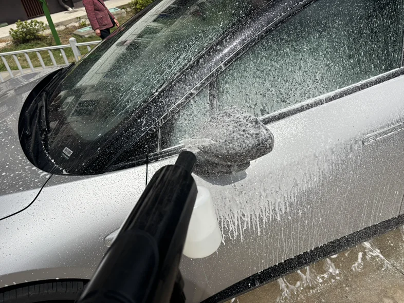 我的洗车步骤一般先从上到下冲掉表面泥沙,避免直接擦拭产生划痕;再打出绵密泡沫,轻轻揉洗每一处细节。
