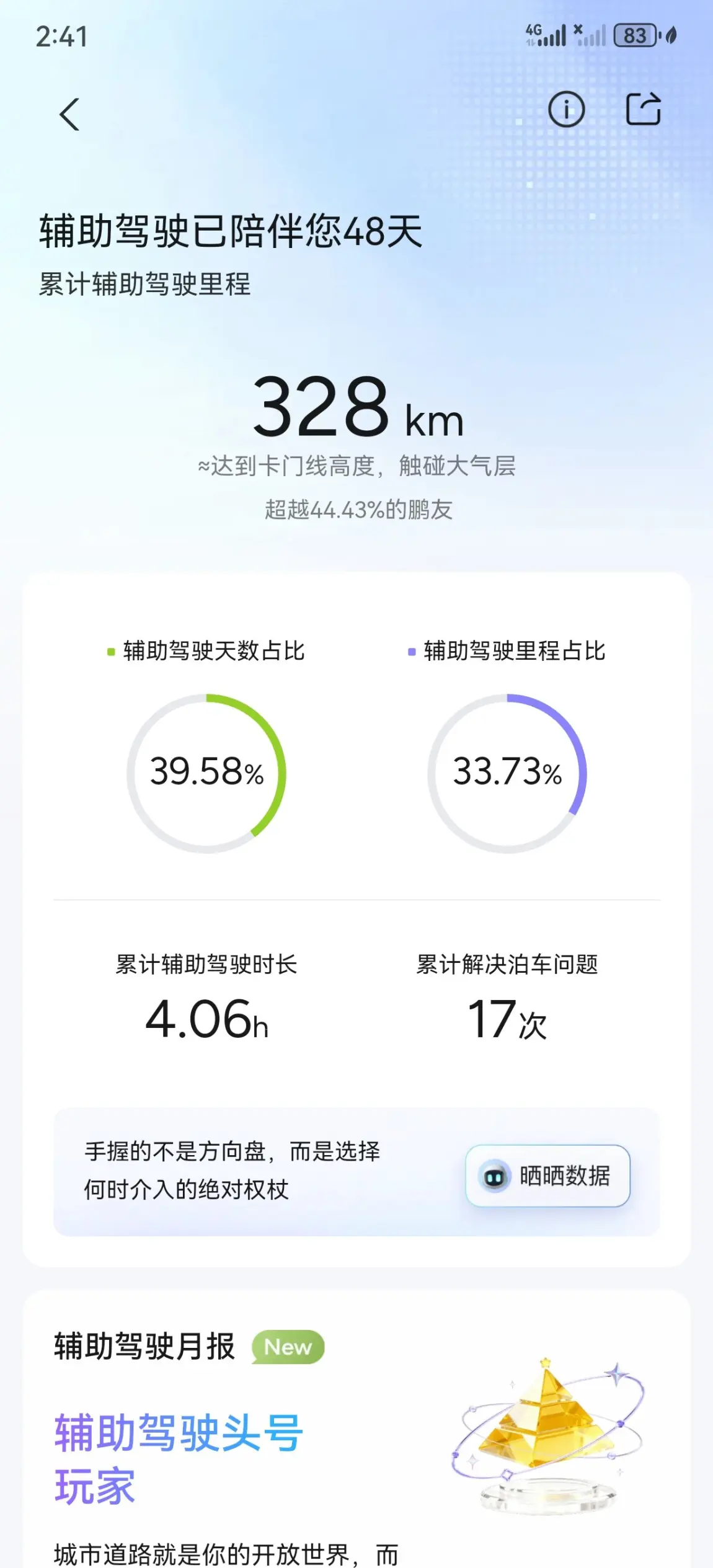先晒出我的智驾数据成绩单:累计辅助驾驶里程328km,超越了44.43%的鹏友;辅助驾驶天数占比39.58%,里程占比33.73%,相当于近四成的出行都交给了G6的智驾系统。累计辅助驾驶时长4.06小时,还靠自动泊车解决了17次泊车难题,不管是侧方停车还是立体车库,都能稳稳拿捏。