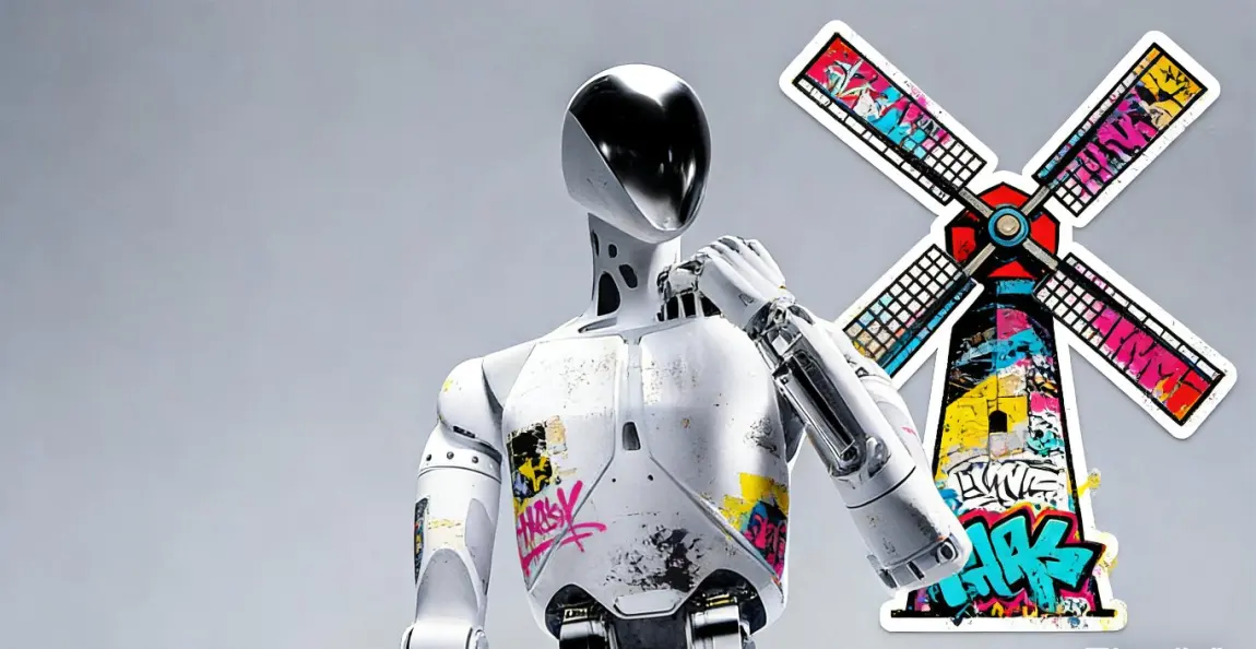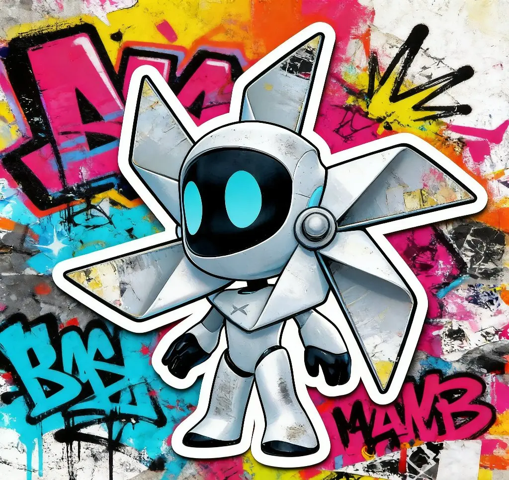 将太空机器人拆解为几何涂鸦色块,搭配喷漆飞溅效果,拼贴复古太空报纸元素,适配小P,打造赛博太空主题