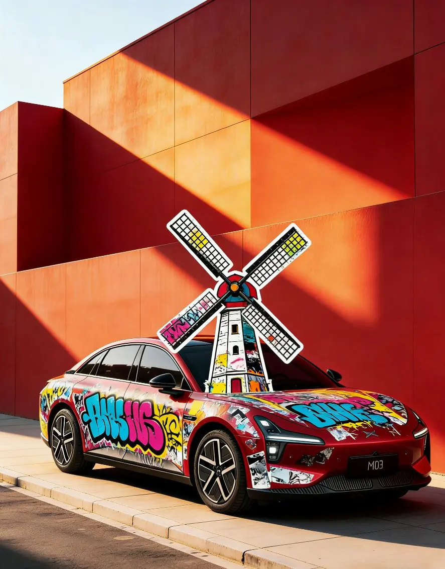 将红色建筑和汽车撞色涂鸦化,拼贴复古日落海报剪片,搭配喷漆泼墨效果,适配车门,打造美式复古街头氛围感。