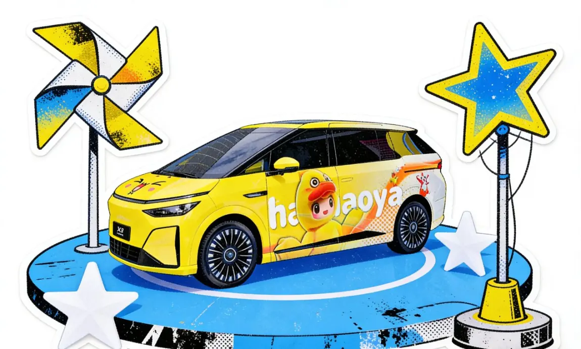 把小黄车和星星做荧光撞色涂鸦,拼贴潮流卡通贴纸和波普线条,适配车身侧裙,打造活力街头玩趣风。