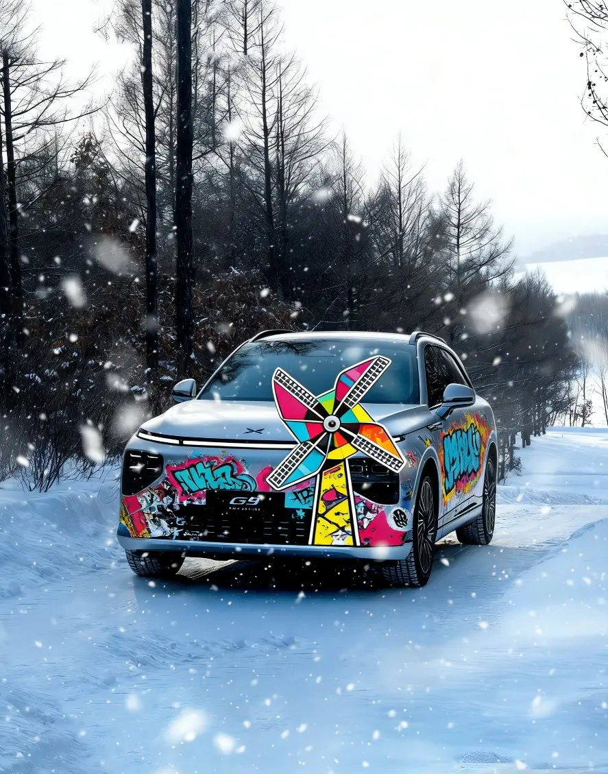 将雪山和汽车做高饱和对比涂鸦,拼贴户外探险杂志剪片,搭配雪花喷漆效果,适配天窗,打造户外机能街头风。