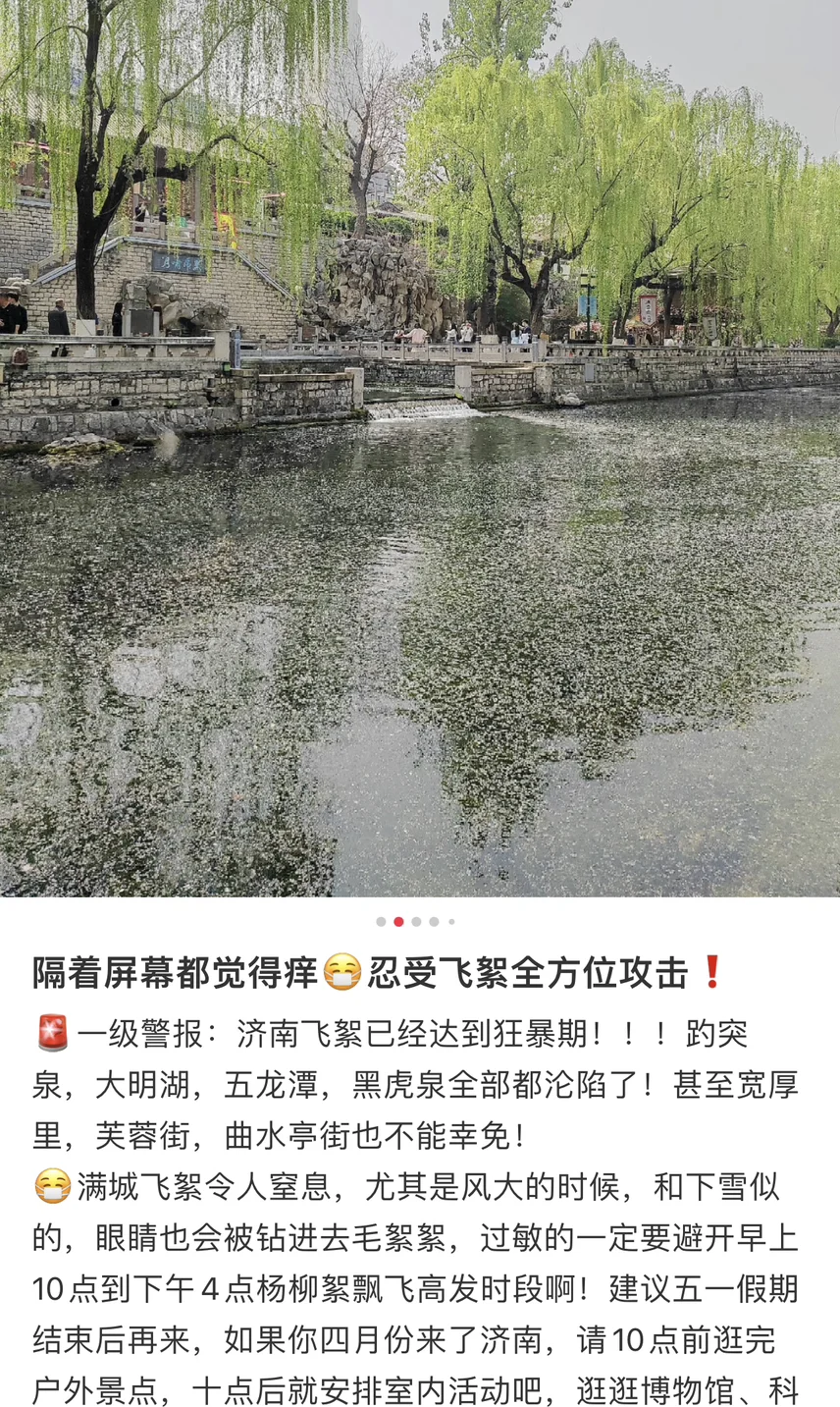 四面荷花三面柳,春天的泉城济南美如画,但是花粉和柳絮也会“如约而至”🤷🏻♂️每年3月底到5月,黑虎泉、大明湖周边的飞絮就像“四月雪”,让人烦恼😩