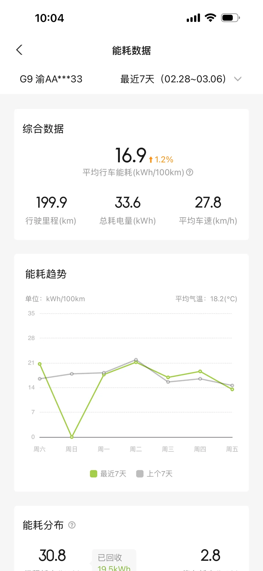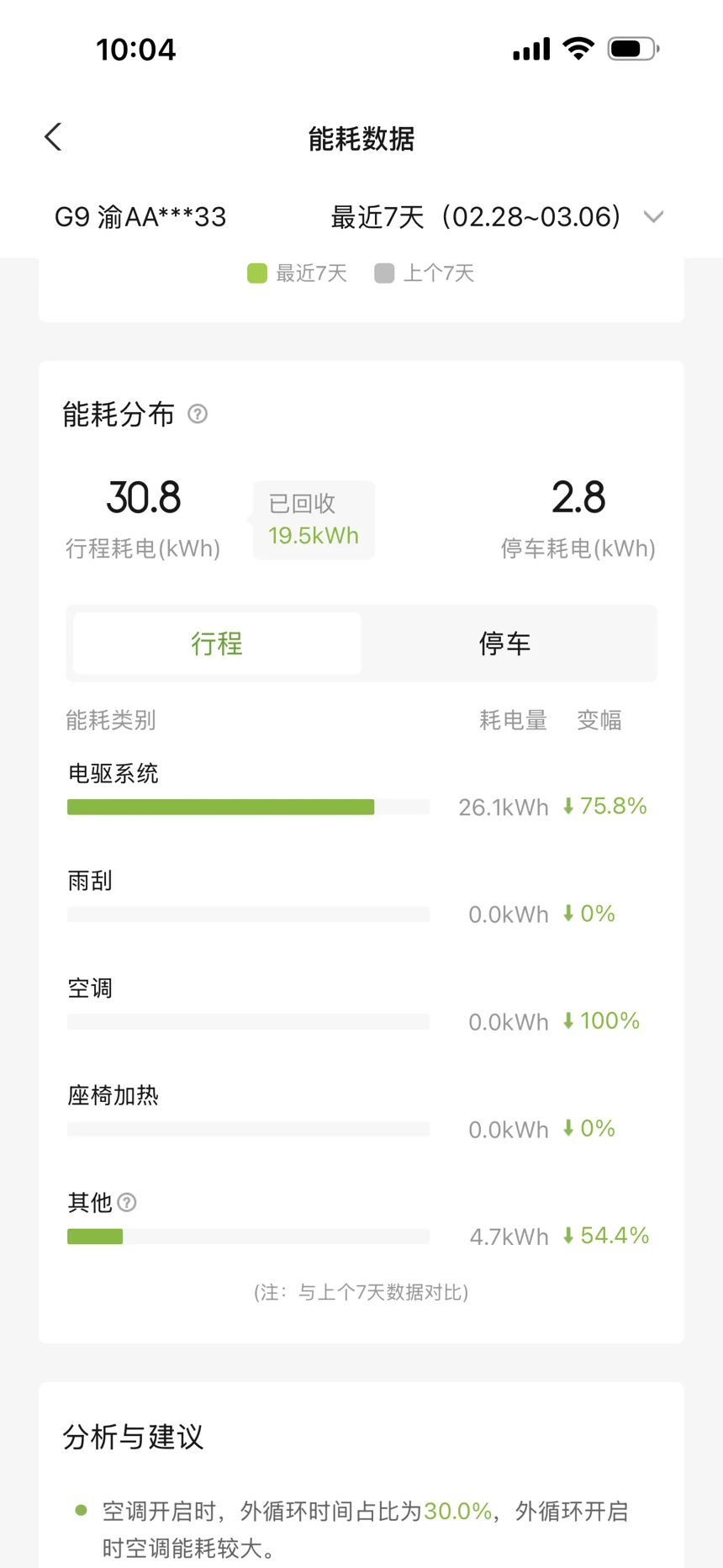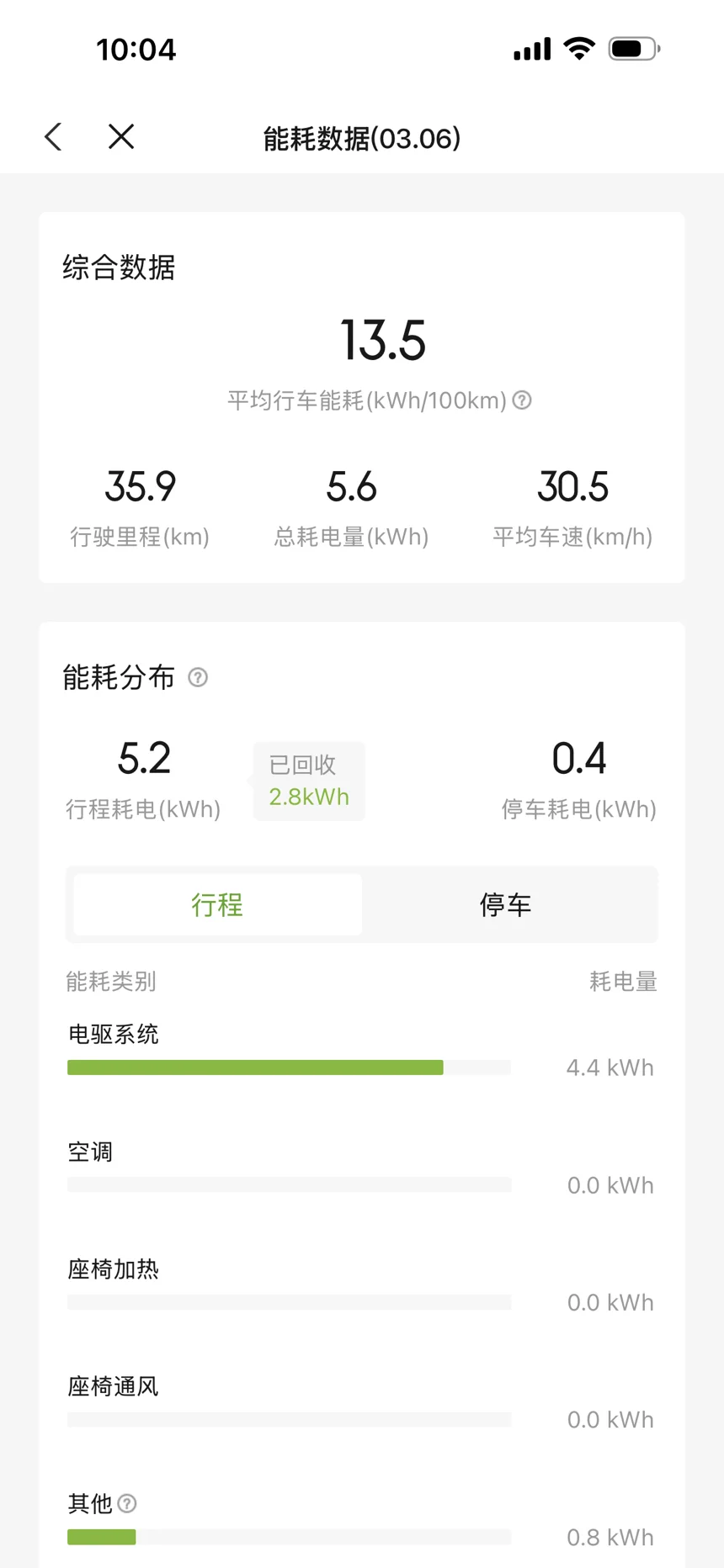 4. 行程与停车:行程耗电5.2kWh(回收19.5kWh),体现能量回收的高效性;停车耗电0.4kWh,建议长时间停车时关闭车辆,避免待机耗电。