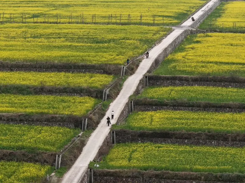 当车辆驶入山间,视野豁然开朗。层层叠叠的梯田顺着山势铺展,明黄色的油菜花在阳光下肆意绽放,像一块巨大的金色绒毯,从山脚一直铺到云端。一条白色的游步道穿梭其间,如同丝带串联起整片花海,而村口那棵苍劲的古樟树,便是这片风景的灵魂。