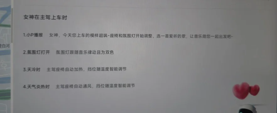 场景触发采用主驾入座自动识别,无需手动操作、无需语音唤醒。当用户坐进主驾并系好安全带,系统即刻激活女神节专属流程。首先由小P送上定制化语音问候,语调柔和、语气亲切,内容可预设为“女神节快乐,愿你自在如风、一路闪耀”,也支持车主自定义祝福,让每一次上车都被温柔迎接,瞬间拉满节日仪式感。