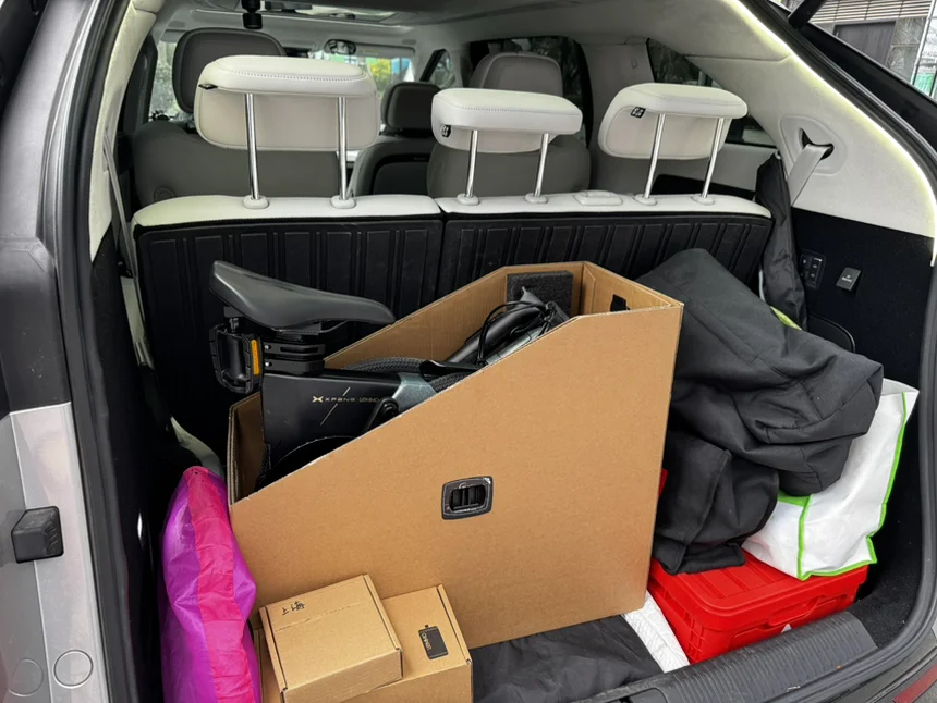 打开全景天窗,樱花云景尽收眼底;超大七座空间从容收纳野餐垫、相机与春日好物。后备箱再放入小鹏X9的最佳拍档,Lemmo折叠电助力自行车。当时眼疾手快的抢到了009号,骑上它瞬间增加了不少出行半径。