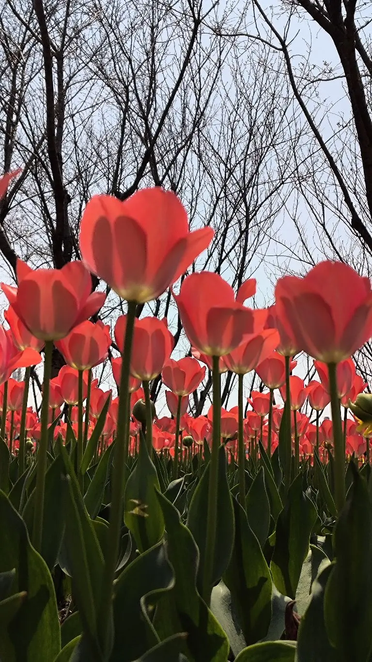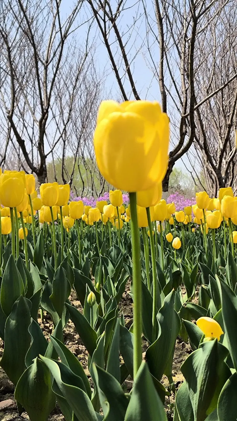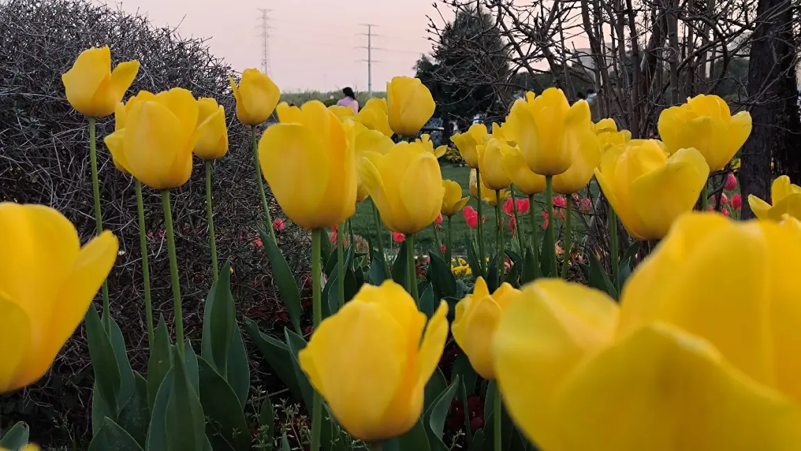 穆湖森林公园的郁金香更野趣!粉郁金香和樱花树“撞了个满怀”,粉花配粉樱,梦幻得像走进童话,黄郁金香像小太阳一样炸眼,随便找个角度拍,都是“春天限定”的氛围感!