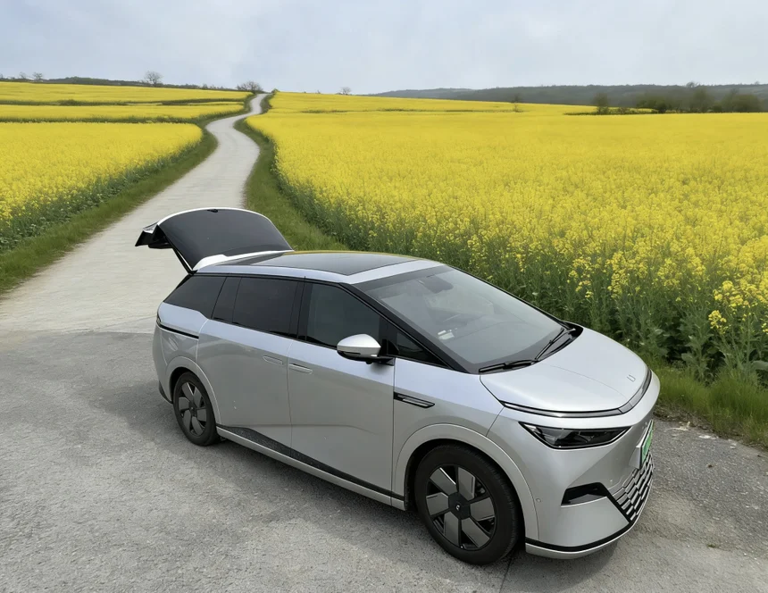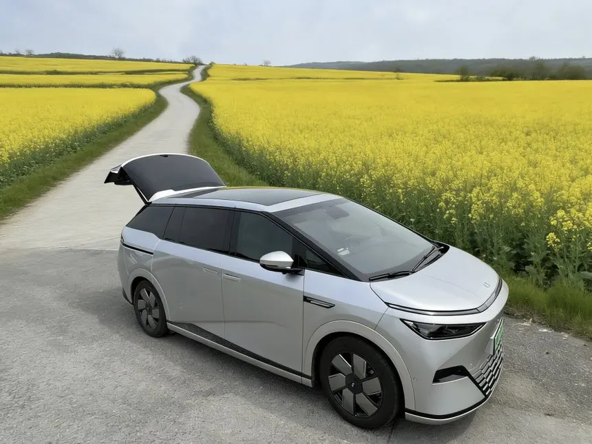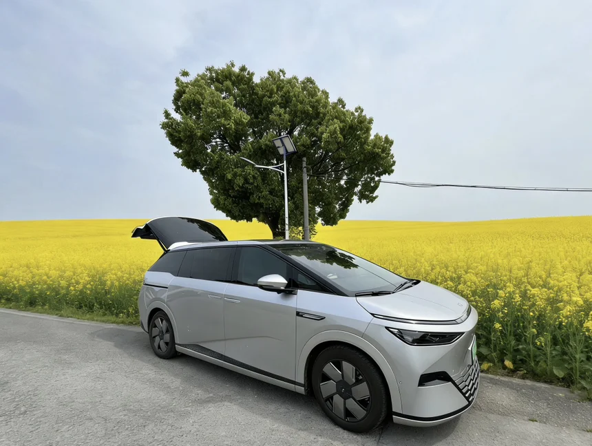下车时,后备箱缓缓升起,风里裹着油菜花的甜香。X9的银灰色车身在明黄花田的映衬下格外亮眼,大尺寸轮毂碾过松软的田埂,留下浅浅的辙印。我们铺开野餐垫,用车载冰箱取出冰镇的气泡水,看蜂蝶在花穗间穿梭,听远处村落传来的犬吠。