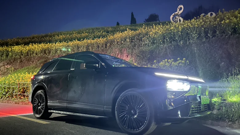 停在梯田旁的小路,G9的贯穿式前灯亮起,与漫山遍野的金黄油菜花形成鲜明对比。我特意用低角度拍摄,让车身与花海同框,车灯的暖光洒在花瓣上,连夜色都变得温柔起来。透过全景天幕,能看到远处山影朦胧,油菜花在微风中轻轻摇曳,仿佛在和G9的星幕车顶对话。