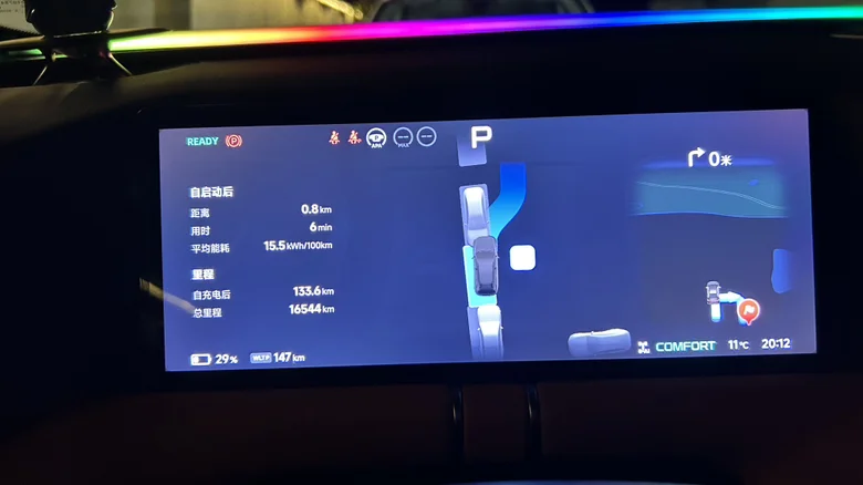 我日常通勤往返约几十公里,路况以城市道路和快速路为主。在气温15-20℃的春日,我刻意练习了“黄金脚法”:尽量保持匀速行驶,避免急加速和急刹车,利用动能回收系统回收更多能量。在这种驾驶习惯下,我的G9百公里能耗稳定在15.5kWh左右。有一次,我全程使用XNGP智能辅助驾驶,系统会根据路况自动调整车速和能量回收强度,最终的百公里能耗甚至降到了14kWh,让我十分惊喜。