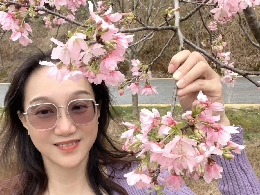 在这樱花轻舞、山色含烟的午后,我牵着风,吻过花枝,笑对镜头——
