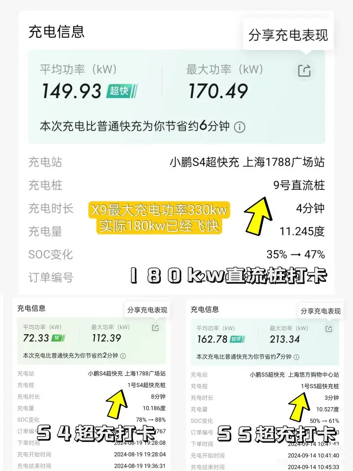 ⚡自营桩:小计124度💰177r。180kw、s4、s5都试过,见p3-4。x9是3c电芯实际功率大差不差,180kw桩5分钟70kw左右,实冲live见p5,自营桩全部积分抵扣并免停车费,所以基本外出逛街冲个10度薅个停车费