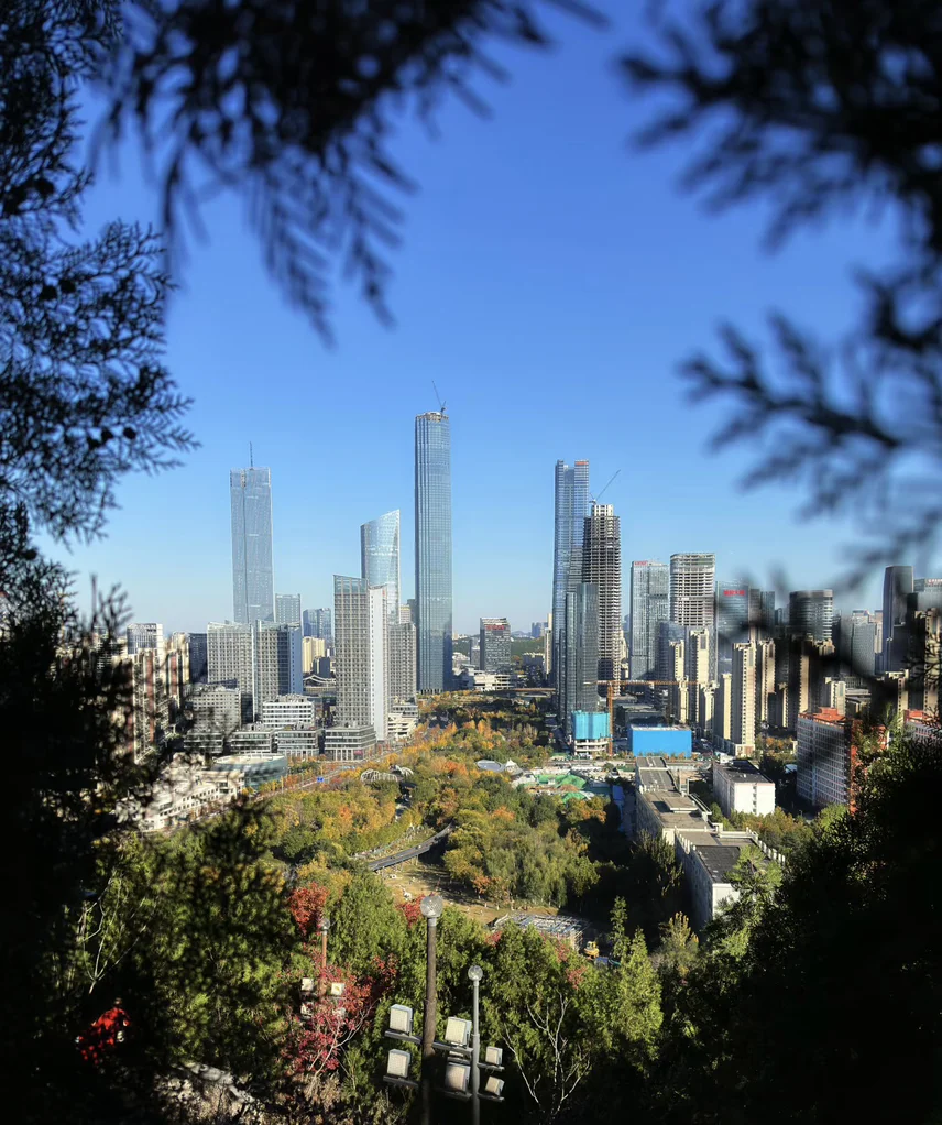 马上就是连翘盛花期,金黄的花海与CBD“山泉湖河城”五座超高层建筑同框,在山顶观景台随手一拍都是大片!