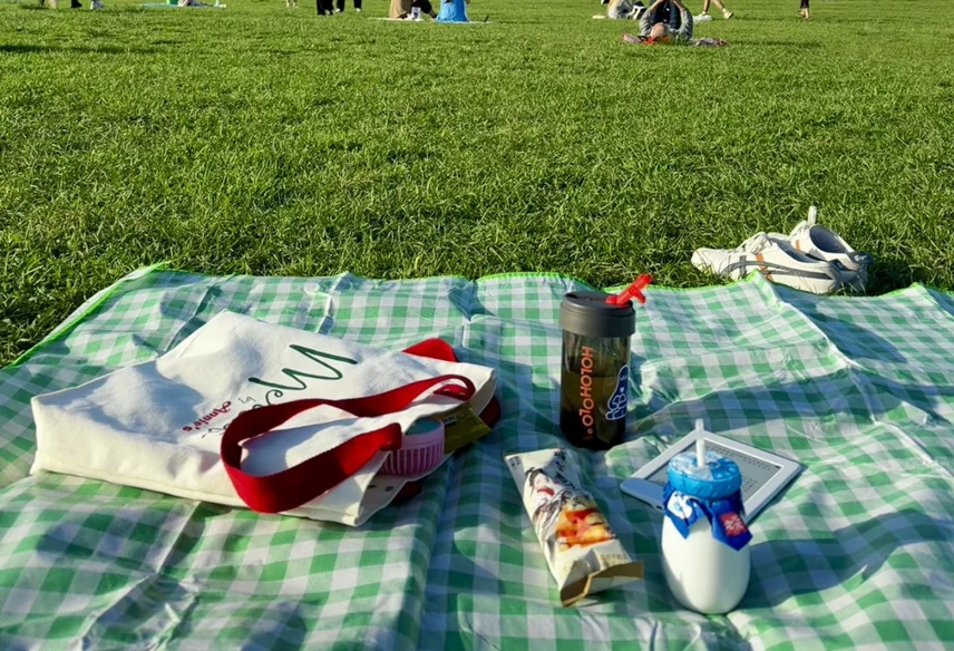选防潮易打理的材质,铺在草地上就能享受阳光野餐。搭配折叠收纳箱装零食水果,规整又方便,到家一冲就干净。