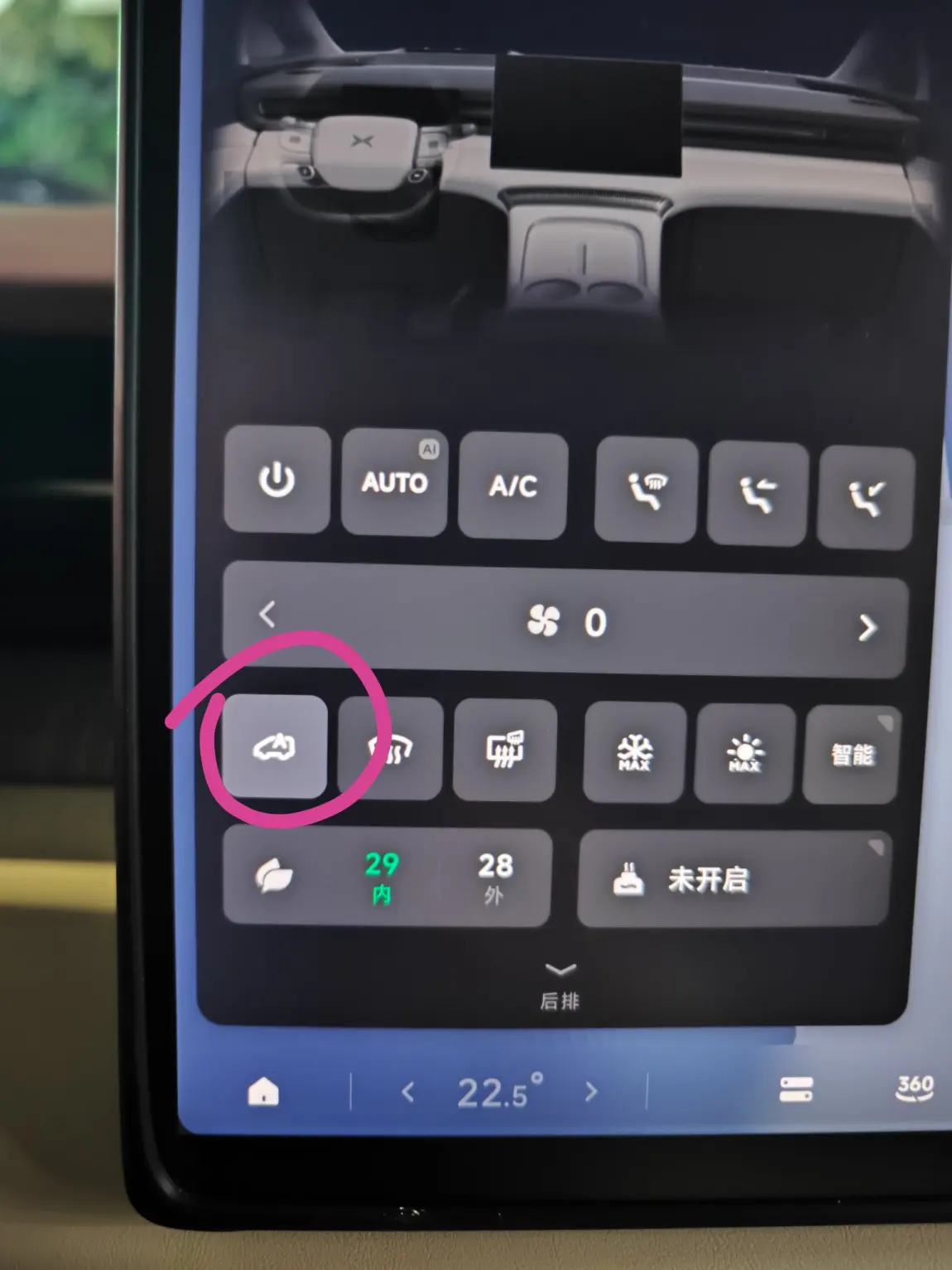 1.不管你有没有开空调,这里坐几个人,建议打开这个循环模式有个a字的,它是会自动根据车内空气质量和自动开启外循环。我发现有了这个功能之后,不用像以前那样子频繁的切内和外,有时候开空调持续打开外循环,对车的耗电量。还是会增加的,自从开了这个A自动判断之后,我发现车子开空调之后比之前省了三四个点的电耗。