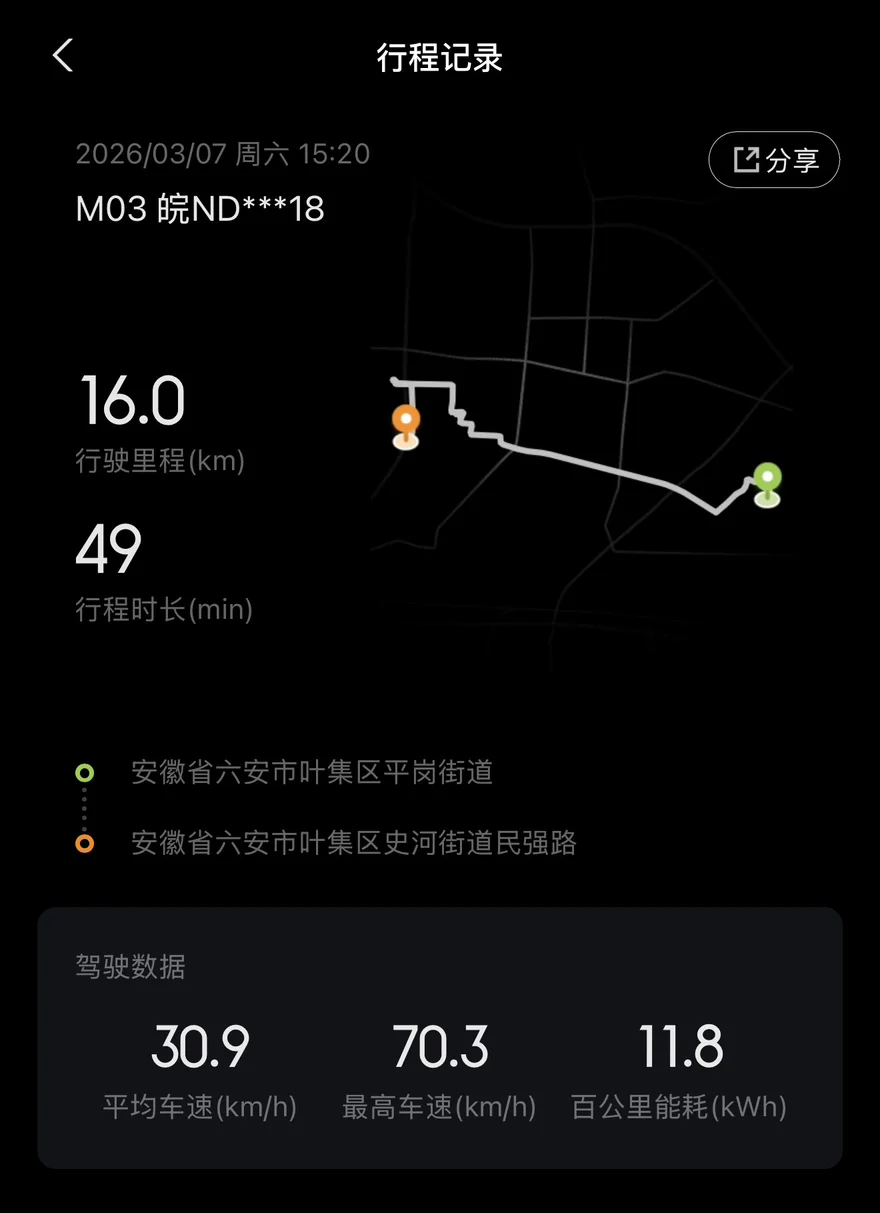 🌿 行程能耗:16km跑了49分钟,百公里能耗11.8kWh