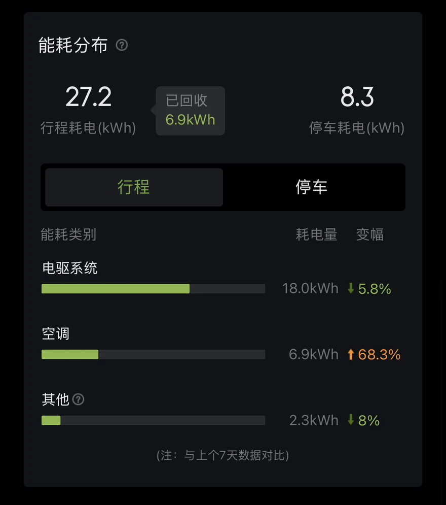安徽最近倒春寒真的很无语,今天给你25℃,明天可能就是断崖式15℃,所以看能耗数据最近一周由于气温波动较大,所以平均能耗来到了14.9,因为环境温度低导致电池活性受影响,加上空调使用变多,能耗自然上去。不过也能看到,电驱系统的能耗比上周降了一点,说明我在驾驶技巧上还是有点进步的!所以空调是大头,春天乍暖还寒,开空调制热的时间多了几乎一倍多。我还用了哨兵模式,这点得注意,以后出门尽量关掉,省点电。
