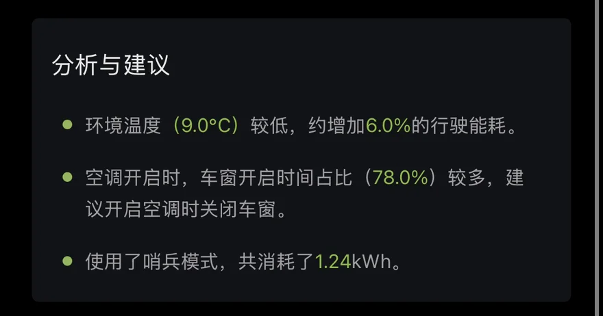 春天温差大,早晚开暖风,中午可以关掉。开空调时一定要关窗!系统提示我车窗开启时间占比78%,太费电了,关窗后空调效率能高很多,还能减少风噪。