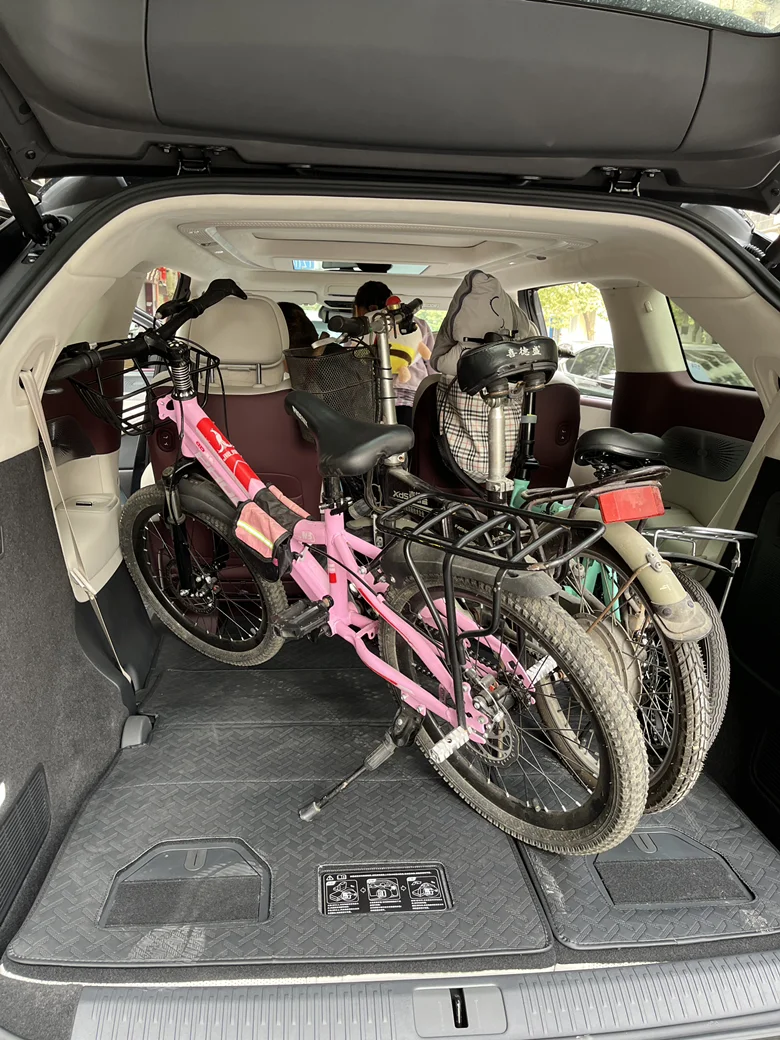 X9这车果然不负众望,特别是在装载方面,这也是当初选车时看重的点,三排折叠后,三台自行车卓卓有余,感觉再放多一台毫无压力,折叠后还有四个位置,一家四口舒舒服服的。