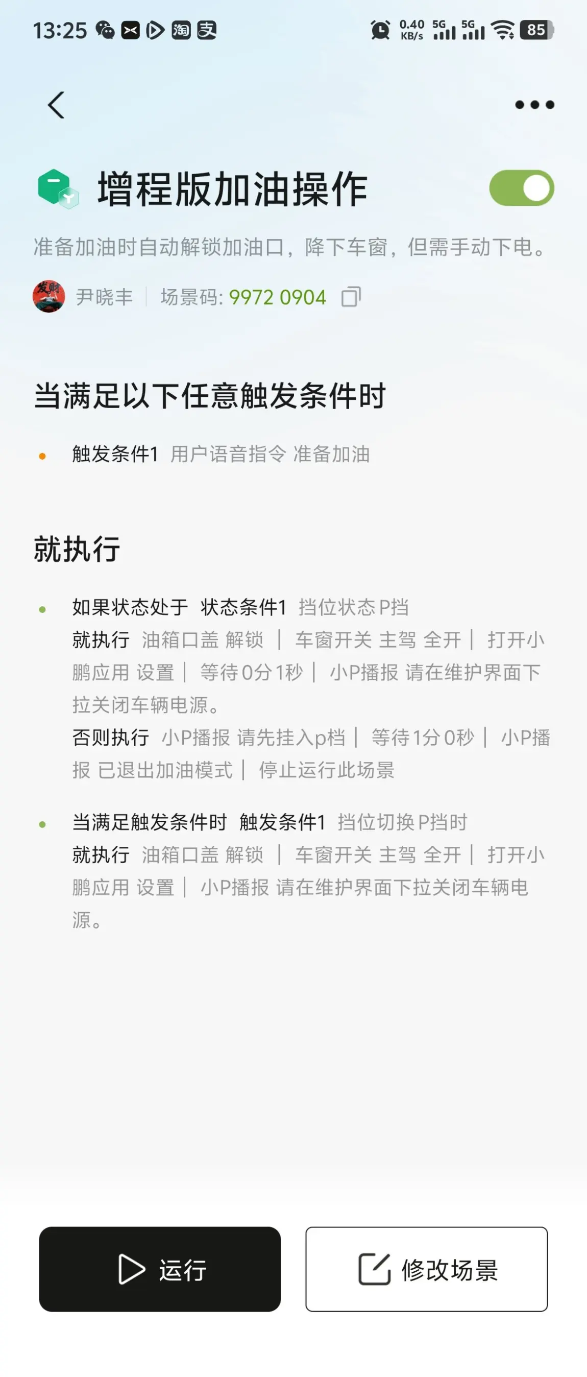 咱们增程版加油需要p档下解锁油箱盖,然后找到设置,找到维护,然后在点击断电才能加油,手忙脚乱的。分享个智慧场景,到加油站后跟小p说准备加油,小p会检测是否挂入p 档,如果没有挂档小p会提示,当挂入p档后会自动打开主驾车窗,解锁油箱盖,中控屏上自动打开设置界面,只需点开维护,点击断电即可。