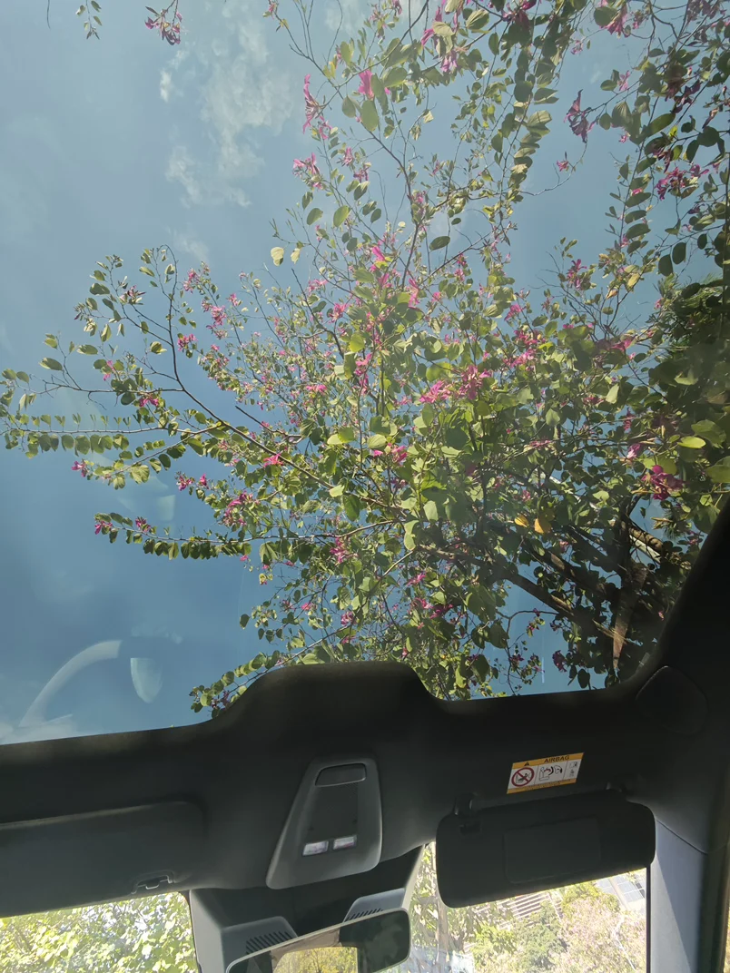 在停车场通过小鹏M03的天幕肆意仰望天空,春风拂过,紫荆肆意绽放。不与百花争艳,却自成一片绚烂,紫韵嫣然,暗香轻漾,是春日里最动人的风景。
